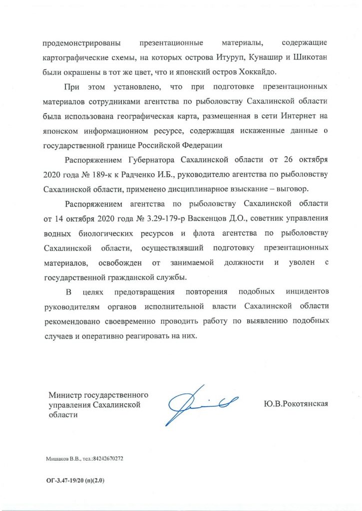 Кроме того, распоряжение агентства по рыболовству Сахалинской области от 14 октября № 3.29-179-р Васкенцов Д.О., советник управления водных биологических ресурсов и флота агентства по рыболовству Сахалинской области, осуществлявший подготовку презентационных материалов, освобождён от занимаемой должности и уволен с государственной гражданской службы.