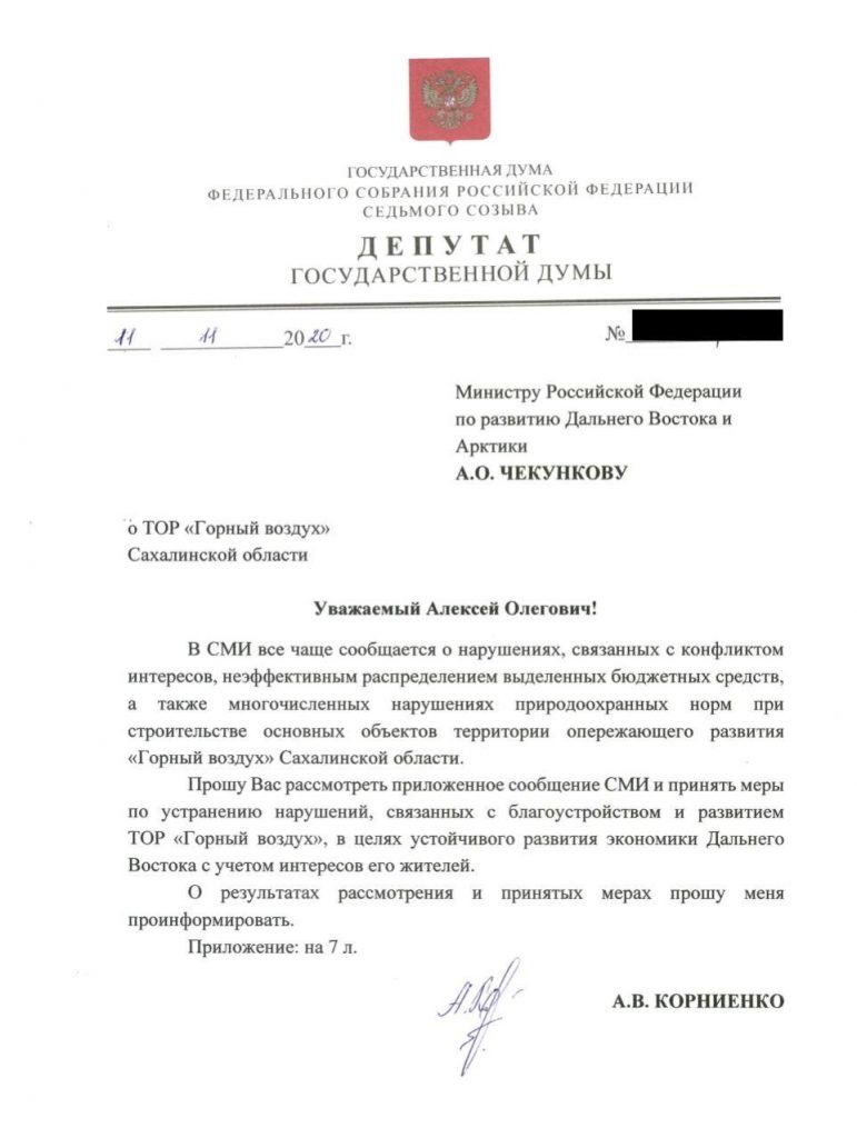 Вот об этом-то я и говорил министру по развитию Дальнего Востока Чекункову: где экологическая экспертиза? Почему резидентам всё можно? Если у вас куча денег и вы хотите выкачать из региона ещё больше денег, это не даёт вам права вредить людям и разрушать природу. Вот и мой первый запрос министру. Надеюсь, отреагирует быстро