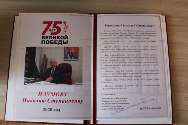 В завершении уходящего года Первый секретарь Сахалинского областного Комитета КПРФ Павел Ашихмин вручил благодарственные письма от депутатов Государственной Думы фракции КПРФ Алексея Викторовича Корниенко и председателя Комитета по региональной политики и проблемам Севера и Дальнего Востока Николая Михайловича Харитонова старейшему коммунисту Сахалинской области Николаю Степановичу Наумову, которому в уходящем году исполнилось 101 год.