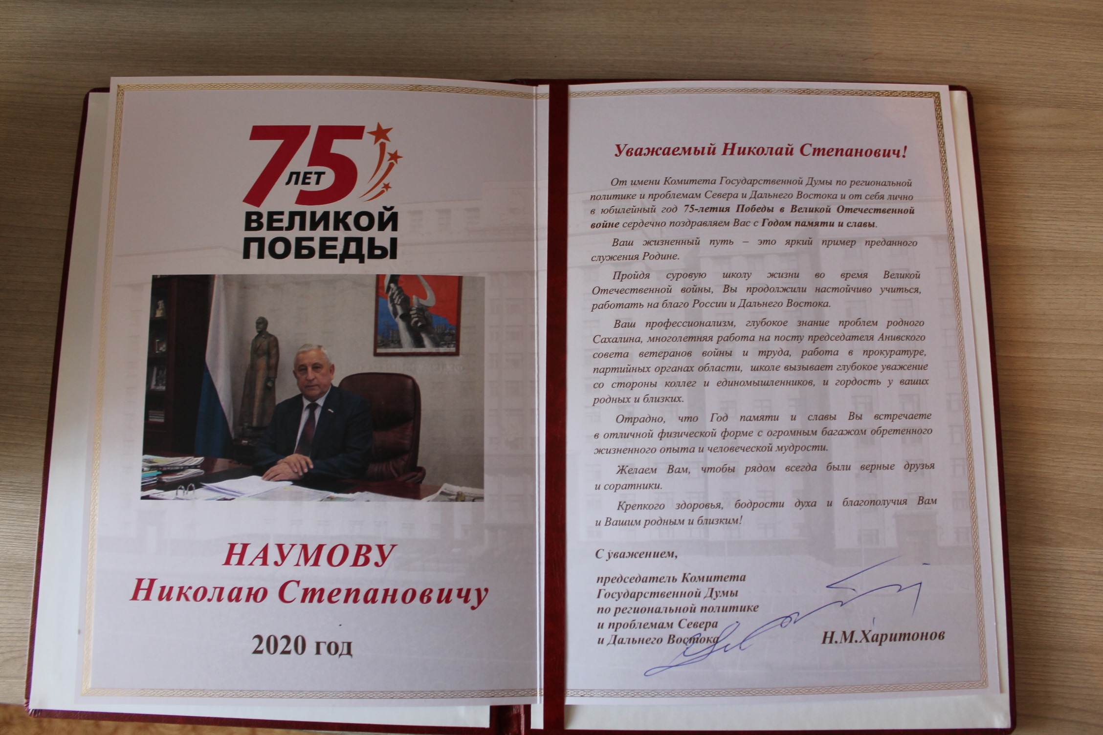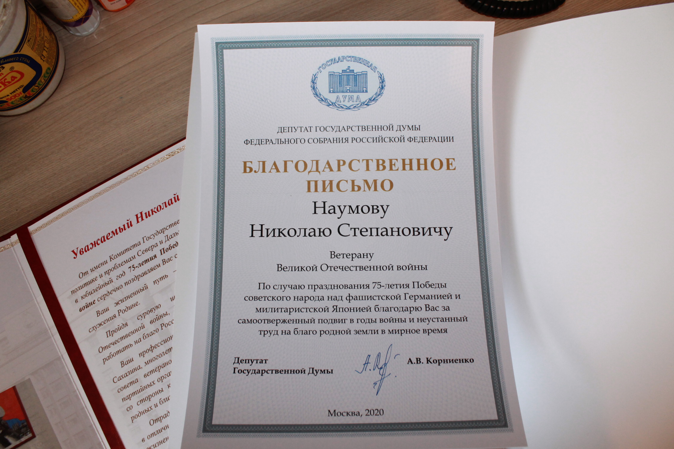 Депутаты фракции КПРФ А.В.Корниенко и Н.М.Харитонов в благодарственных письмах выразили признательность самоотверженному подвигу Николая Степановича в годы войны, трудовым заслугам в послевоенное время и вкладу в общественно-политическую работу и патриотическое воспитание подрастающего поколения!