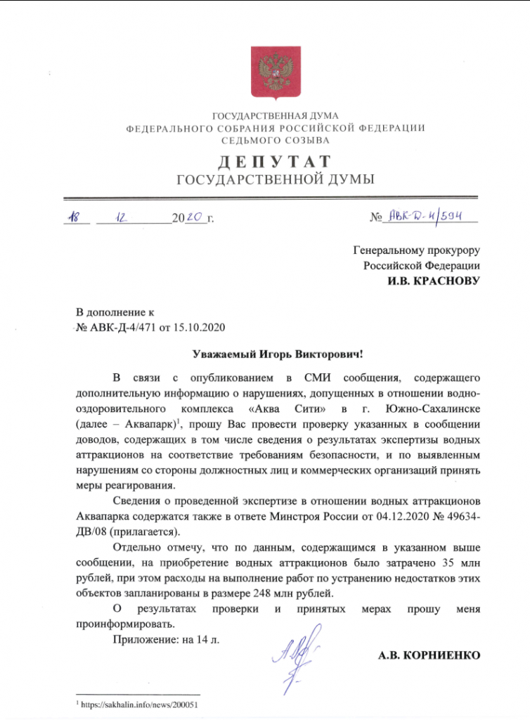 В декабре 2018 года подозреваемым был подписан акт приема-передачи указанного многофункционального центра, в том числе водно-оздоровительной зоны, где расположены водные аттракционы, на основании которого произведена окончательная оплата поставленного объекта.