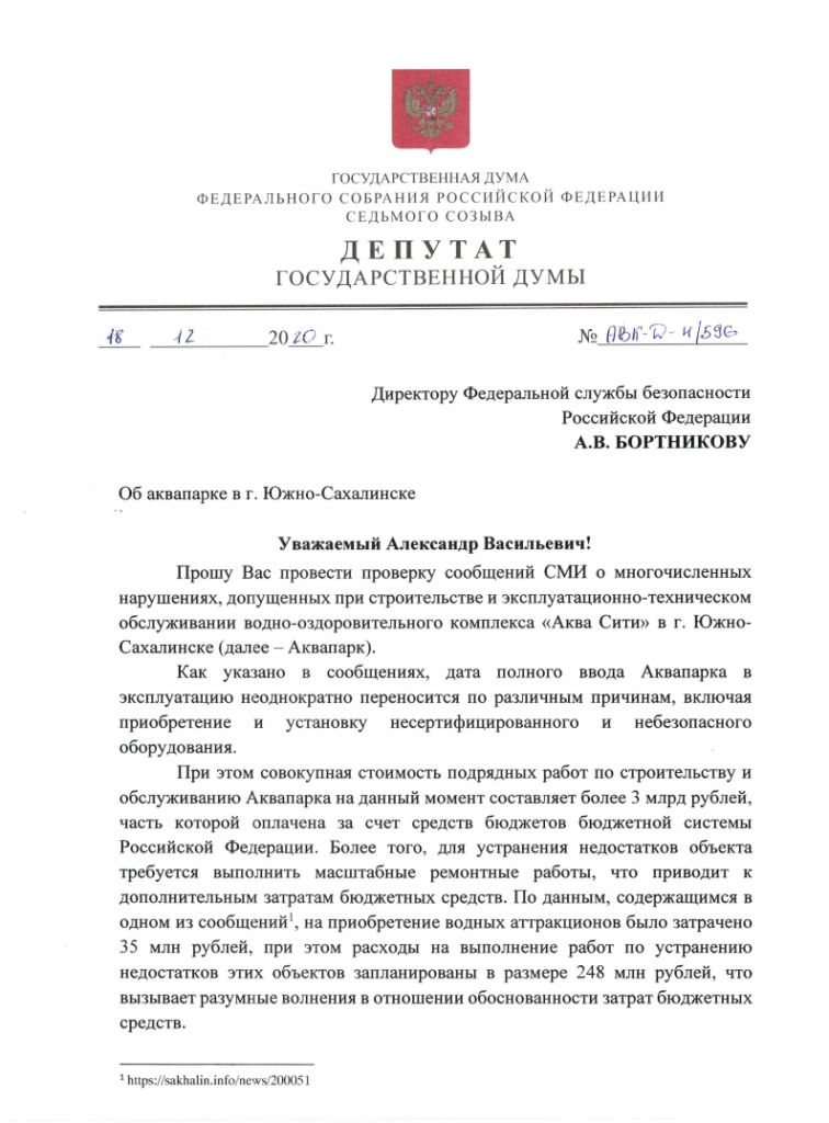 По версии следствия, подозреваемый, занимая государственную должность Сахалинской области – министра экономического развития островного региона, являлся представителем заказчика по государственному контракту о приобретении Многофункционального центра со встроенными помещениями водноспортивного, физкультурно-оздоровительного назначения «Аква Сити» у одной из коммерческих организаций.