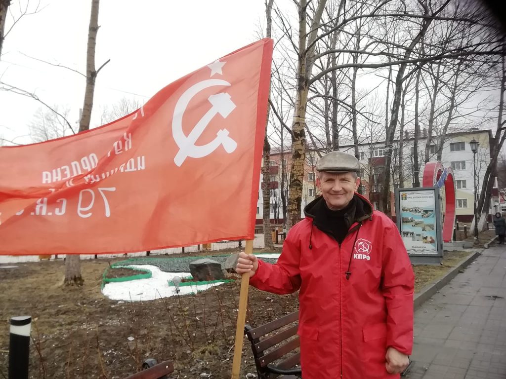 А макаровское отделение КПРФ отметило праздник 1 мая одиночным пикетом в городском парке.