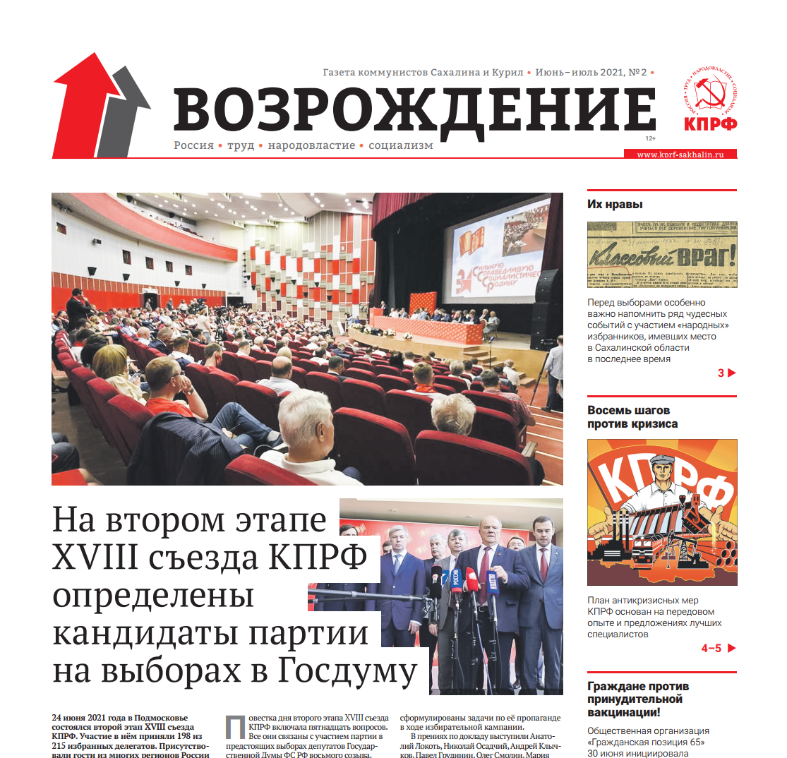 Вышел в свет очередной номер печатного издания Сахалинского областного отделения КПРФ, газеты “Возрождение”.