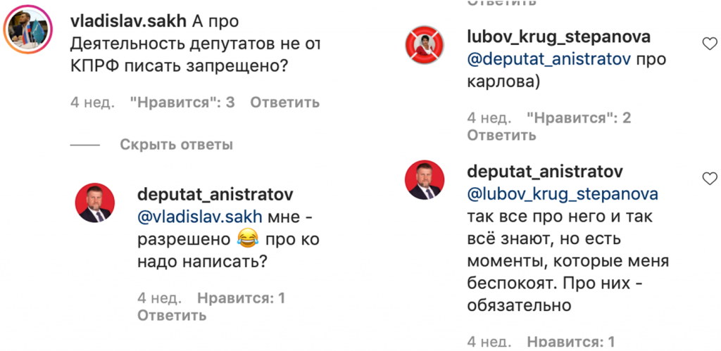 Вот пример подобного поста, можете сами убедиться. Показательны комментарии – например, депутат Гордумы Владислав Глухов укоряет нашего героя, что пишет негатив он исключительно про кандидата КПРФ, а комментаторы намекают, что к кандидату от Единой России Карлову вопросов множество (тот постоянно мелькает в новостных сюжетах, без оплаты эфирного времен, что уже «является» явным нарушением избирательного законодательства, а справедливорос почему-то молчит, в агитации «единоросса» нарушений не видит. От вопроса Анистратов уходит и обещает «обязательно» рассказать свое мнение про грехи Георгия. Был ли негатив в сторону Карлова на странице «праведника» с того июльского дня? Вопрос риторический. (на момент публикации настоящей статьи не было)