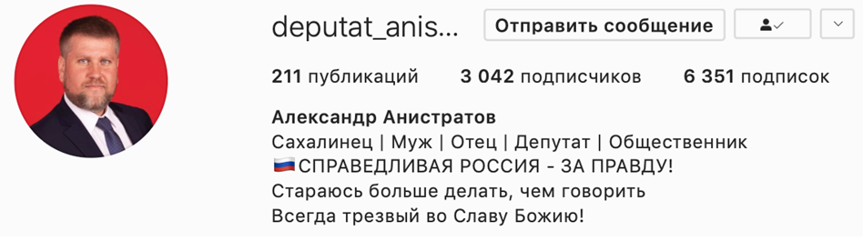 На своей странице в Инстаграм он – трезвенник, праведник, христианин. Ленту его читать в целом скучно – посты про то, как он, Александр, получил благословение от батюшки, как он любит свою красавицу-жену, как тяжело ему от всей этой политической жизни. Жалобы, жалобы, жалобы. Прямо посочувствовать человеку хочется, но если ознакомиться с его политическими шагами, то становиться ясно, что эта «праведная» жизнь – просто имидж, хорошо если хотя бы им самим придуманный. Потому жители области ему и не верят, голосовать явно не собираются, а в телеграм-каналах и подавно его величают исключительно ироничными прозвищами. Судя по всему, поняв, что в бюллетене за него галочку поставит разве что собственная жена, Анистратов решил использовать остатки медийности для атак на действительно сильного кандидата от КПРФ, Алексея Корниенко.