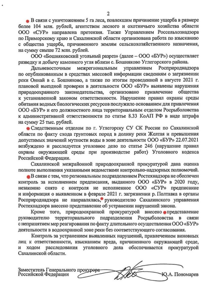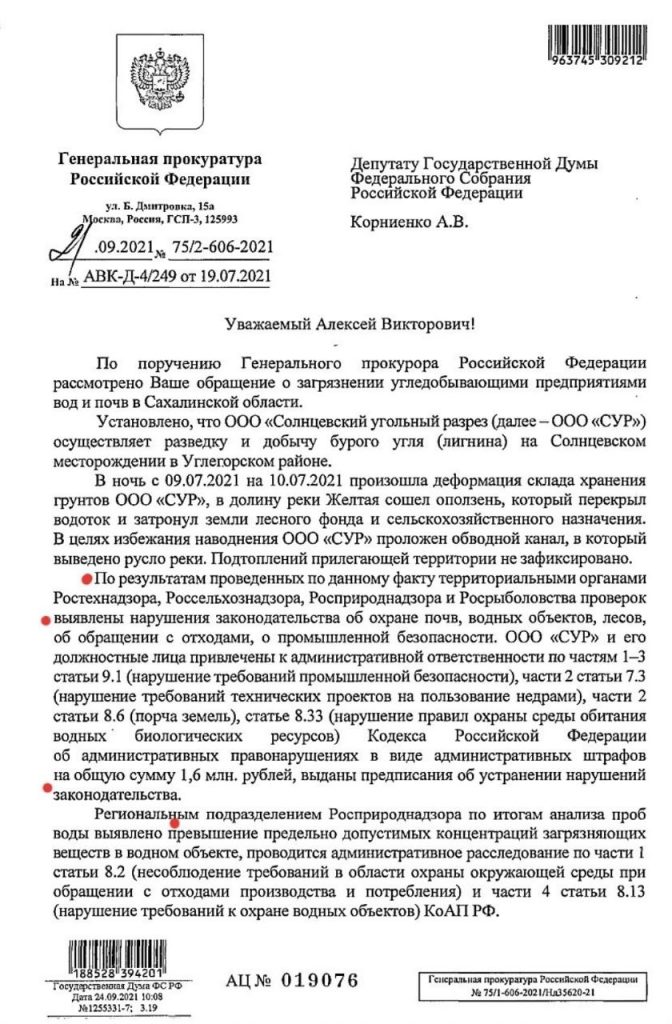 Кроме того, выяснилось, что уничтожено 5 га леса, это повлекло причинение ущерба в размере более 104 млн рублей, и агентством лесного и охотничьего хозяйства области Солнцевскому угольному разрезу направлена претензия. Также Россельхознадзором организована работа по взысканию ущерба, причиненного землям сельскохозяйственного назначения, на сумму свыше 72 млн рублей. Плюс ООО “СУР” и его должностные лица привлечены к административной ответственности по частям 1‑3 статьи 9.1 (нарушение требований промышленной безопасности), части 2 статьи 7.3 (нарушение требований технических проектов на пользование недрами), части 2 статьи 8.6 (порча земель), статье 8.33 (нарушение правил охраны среды обитания водных биологических ресурсов) Кодекса РФ об административных правонарушениях в виде административных штрафов на общую сумму 1,6 млн рублей, выданы предписания об устранении нарушений законодательства.
