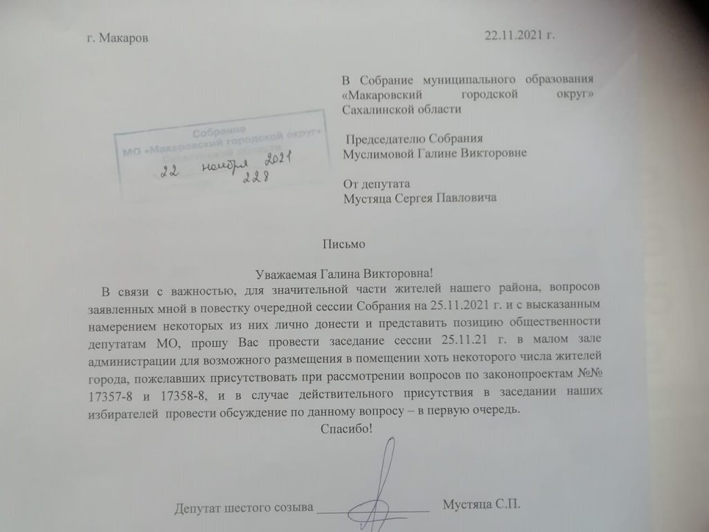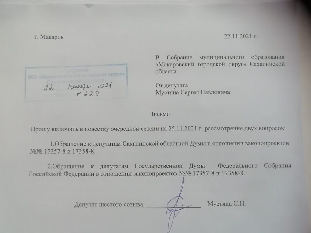 Депутат Мустяца Сергей, сегодня, 22.11.21 г. внёс в повестку сессии Макаровского Собрания на 25.11.21 г. в 10.00 вопрос о недопустимости введения в России QR-кодов, в связи с чем предложил районным депутатам принять соответствующие Обращения к депутатам государственной и областных Дум, голосовать ПРОТИВ! этих законопроектов с номерами 17357-8 и 17358-8.