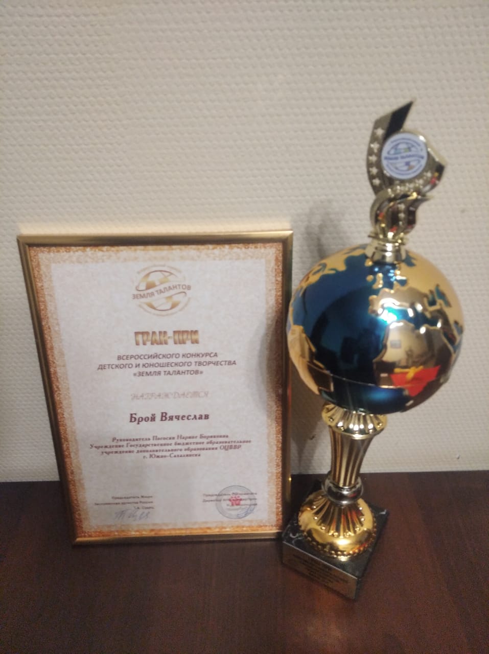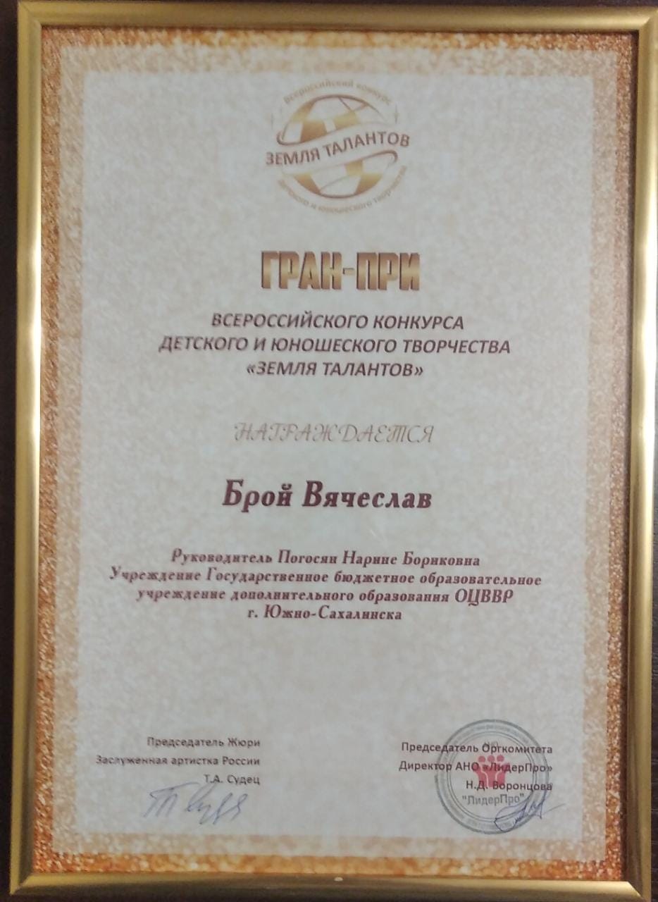 Участник финала, победитель Сахалинского регионального этапа конкурса Вячеслав Брой взял кубок гран-при Всероссийского конкурса «Земля талантов» . На конкурс Вячеслав Брой вышел с песней Н.Добронравова и А.Пахмутовой “Обнимая Небо”, а в финальном гала-концерте Вячеслав Брой пел в составе вокальной группы из профессиональных вокалистов песню “Я Земля” (слова: Евгения Долматовского), а также принял участие в исполнении гимна конкурса “Земля Талантов”.