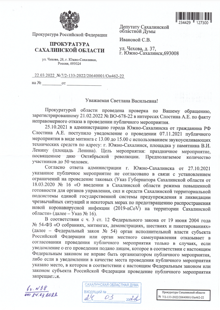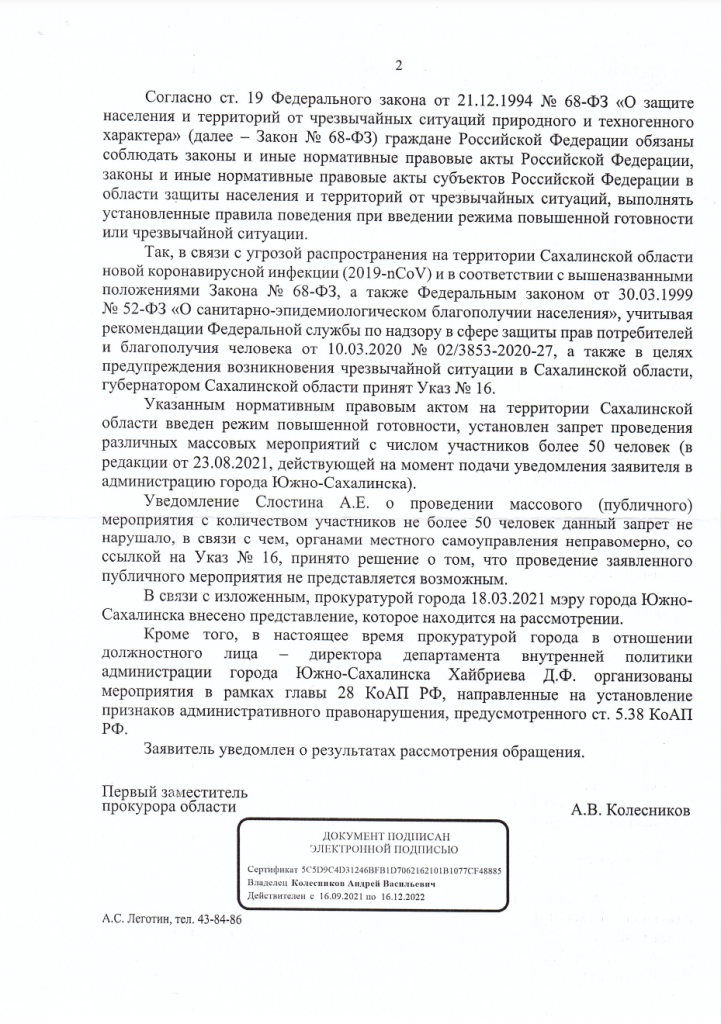 Дело в отношении Д.Ф.Хайбриева было возбуждено прокуратурой города Южно-Сахалинска в связи с неправомерным решением Д.Ф.Хайбриева об отказе в согласовании митинга в день 104й годовщиной Великой Октябрьской социалистической революции – 7 ноября 2021 года. Прокуратура усмотрела, что в действиях Д.Ф.Хайбриева содержатся признаки административного правонарушения ответственность за совершение которого предусмотрена ст.5.38 КоАП РФ (Нарушение законодательства о собраниях, митингах, демонстрациях, шествиях и пикетировании).