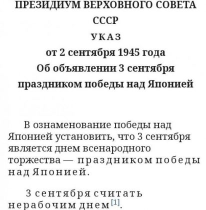 Подписанием 2 сентября 1945 г. акта о безоговорочной капитуляции Японии перед союзными государствами – Великобританией, Китаем, США и Советским Союзом – закончилась Вторая мировая война. Следующий день – 3 сентября в Советском Союзе был объявлен выходным днём всенародного торжества – Днём Победы над Японией.
