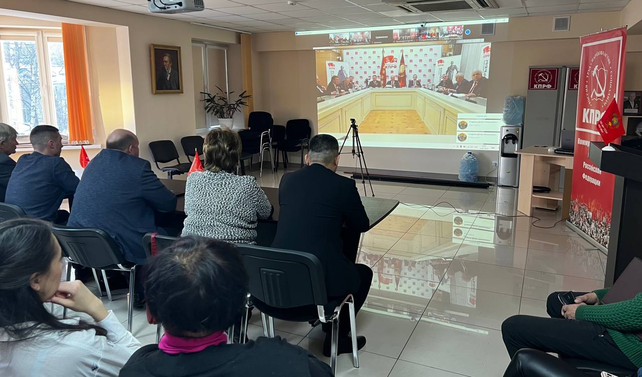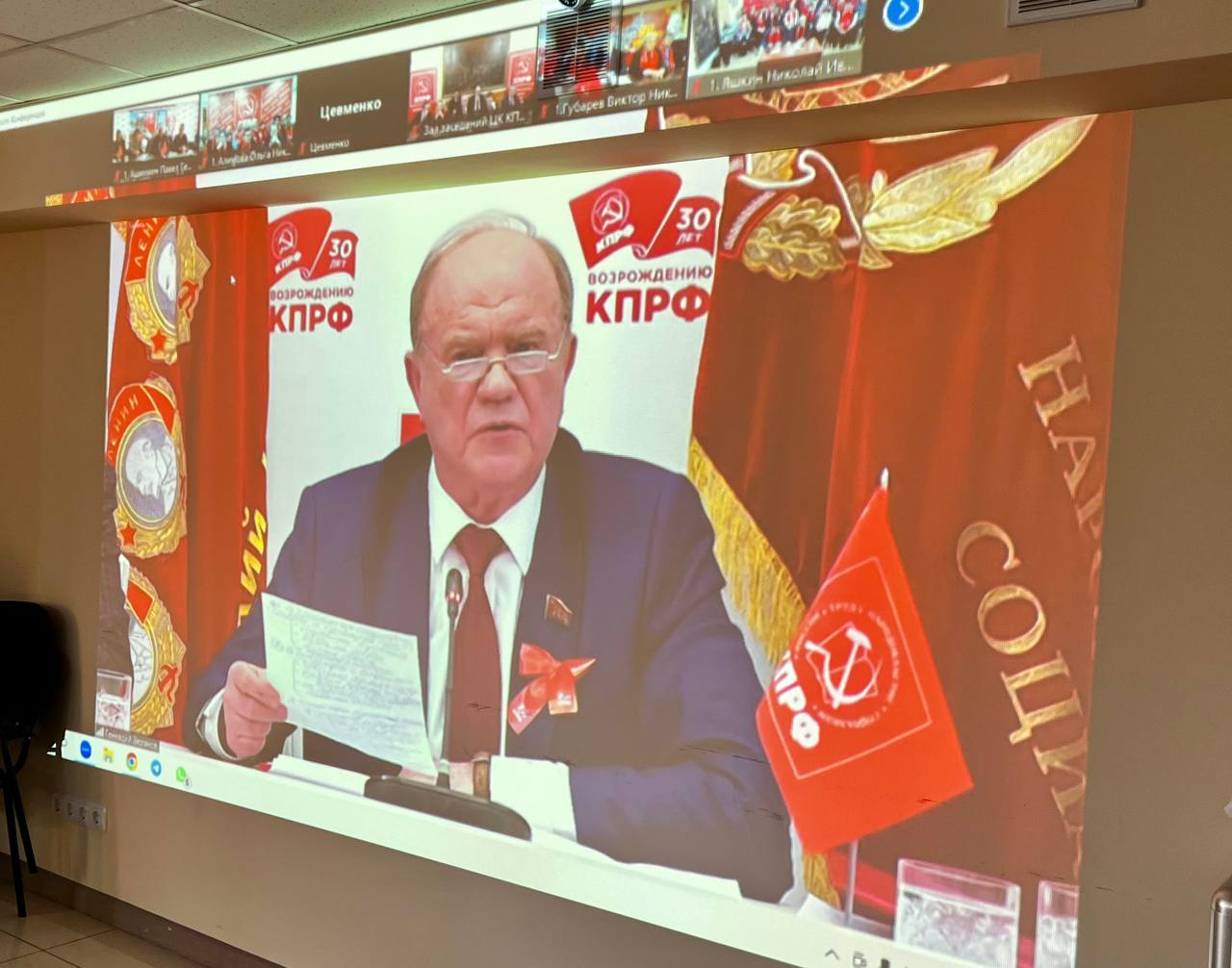 Далее в режиме видео-конференции состоялось торжественное собрание, посвященное 30-летию возрождения КПРФ, организованное Центральным Комитетом КПРФ. С широким докладом выступил Председатель ЦК КПРФ Геннадий Андреевич Зюганов. В ходе торжественного собрания были показаны видеосюжеты из разных региональных отделений КПРФ. Выступавшие рассказывали о деятельности своих партийных организаций, – пикетах, демонстрациях в защиту прав трудящихся, о помощи военнослужащим в СВО и беженцам. Также перед собравшимися выступил лидер Украинских коммунистов Петр Николаевич Симоненко.
