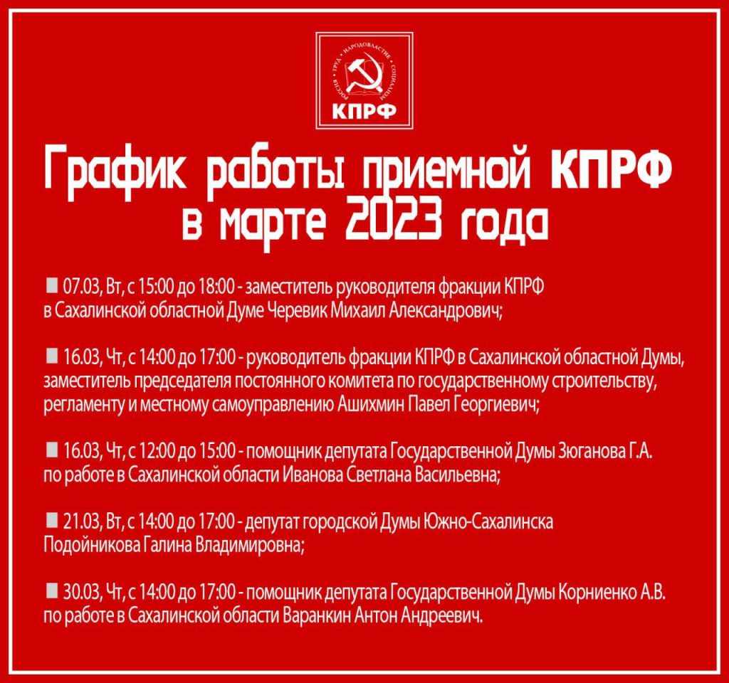16.03, Чт, с 14:00 до 17:00 – руководитель фракции КПРФ в Сахалинской областной Думы, заместитель председателя постоянного комитета по государственному строительству, регламенту и местному самоуправлению Ашихмин Павел Георгиевич;