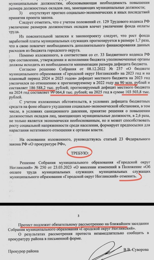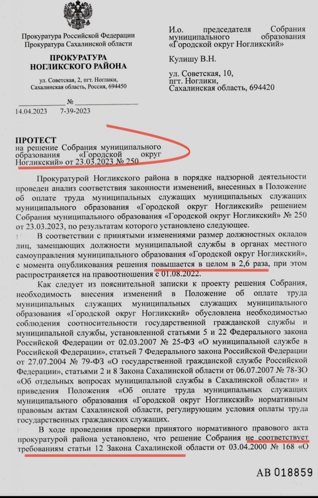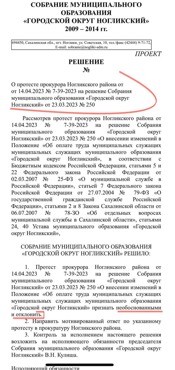 Не можем точно сказать, повлияла ли наша публикация, но прокуратура Ногликского района вынесла протест на это решение Собрания, требуя его отменить. Прокуратура считает повышение должностных окладов в 2,6 раз явно необоснованным. Кроме того, предлагает депутатам подумать о значительном росте дефицита бюджета, вызванном этим повышением.