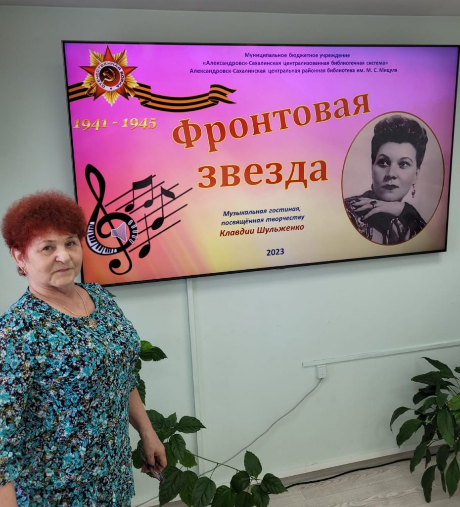 6 мая 2023 года в библиотеке им. М.С. Мицуля города Александровск-Сахалинский состоялось мероприятие “Музыкальная гостиная “Фронтовая звезда”, посвящённая творчеству Клавдии Шульженко и предстоящему Дню Победы .