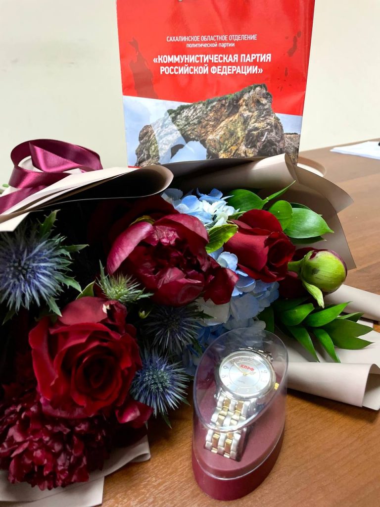 В завершении конференции члены партии КПРФ поздравили с Днем рождения Александра Алямкина – 1-ый секретарь Комитета Смирныховского местного отделения. Александр – коммунист со стажем, всегда принимает активное участие во всех событиях и вопросах партии. В этом году он отметил 70 лет! Юбиляру пожелали крепкого здоровья, долгих лет жизни и семейного благополучия.