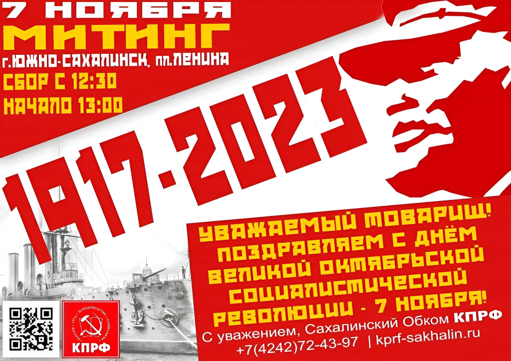 7 ноября 2023 года, в 106-ю годовщину Дня Великого Октября, Сахалинский областной Комитет Коммунистической партии Российской Федерации, фракция КПРФ в Сахалинской областной Думе, Комсомол Сахалина и Курил, совместно с общественниками проведут торжественный митинг.