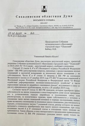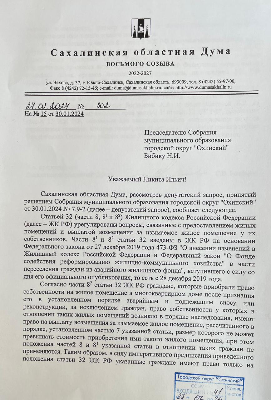 Депутаты Охинского Собрания обратились в областную Думу с просьбой о помощи. Понятно, что проблема в Федеральном законодательстве, но ведь, в конце концов, у Облдумы есть полномочия законодательной инициативы.
