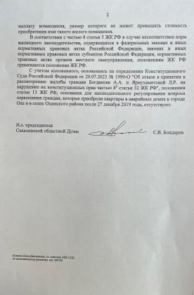 И вот эти две категории граждан попали в суровую ловушку Жилищного кодекса… Благодаря поправкам 2019 года они больше НЕ могут претендовать на переселение в южные районы Сахалинской области. НЕ могут надеяться на получение нового жилья. И даже «вторичка» купившим аварийное жилье НЕ достанется. Все, на что они могут рассчитывать – денежная компенсация стоимостью примерно в полтора туалета.