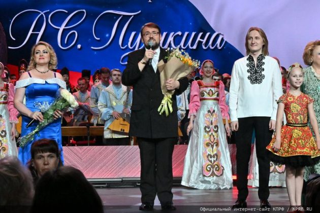 – Дорогие товарищи и друзья. В главном зале страны мы сегодня проводим вечер, посвященный 225-й годовщине со Дня Рождения Александра Сергеевича Пушкина.