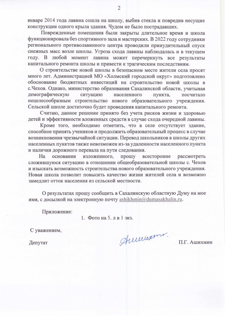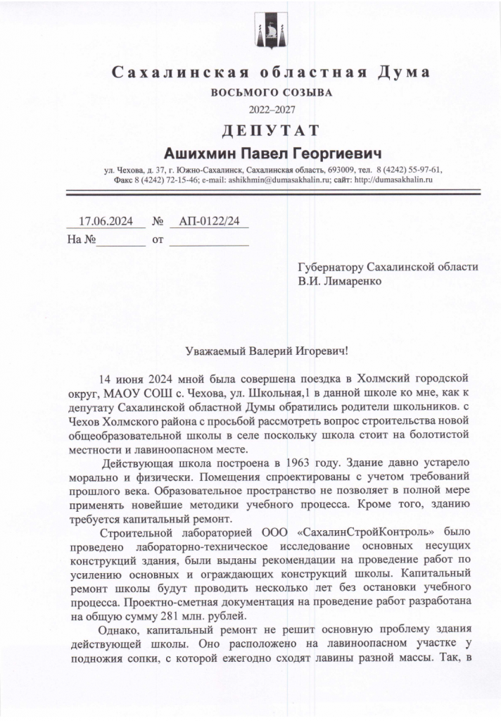 Я считаю, что новая школа необходима, исходя из того, что место опасное и смысла в капитальном ремонте нет. Поэтому я, как депутат 🛠Сахалинской областной думы, сделал обращение в адрес губернатора Сахалинской области.