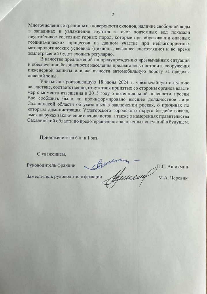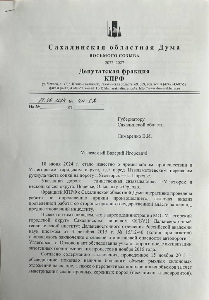 Руководитель фракции КПРФ в Сахалинской областной Думе Павел Ашихмин сообщил в своем телеграмм канале ( https://t.me/ashikhmin_deputat65/42 ) о том, что депутаты фракции КПРФ (Ашихмин П.Г. и Черевик М.А.) направили обращение губернатору по ситуации с оползнем, который сошел в Углегорском районе 17 июня.