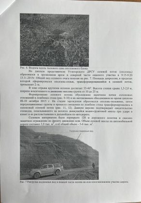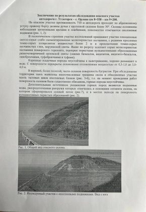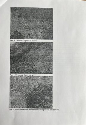 проведенное 15 ноября 2015 г. обследование показало наличие большого объема рыхлых склоновых отложений на склоне, а также о перспективах пополнения их объемов за счет выветривания слабо прочных коренных пород (песчаников и алевролитов). Многочисленные трещины на поверхности склонов, наличие свободной воды в западинах и увлажнение грунтов за счет подземных вод показали неустойчивое состояние горных пород, которые при образовании опасных геодинамических процессов на данном участке при неблагоприятных метеорологических условиях (циклоны, весеннее снеготаяние) и во время землетрясений будут сходить регулярно.