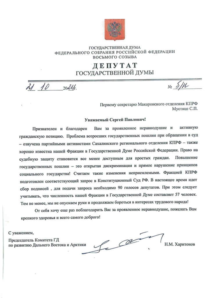 Обращение сахалинских коммунистов к Харитонову Н.М., Председателю комитета Государственной Думы по развитию Дальнего Востока и Арктики