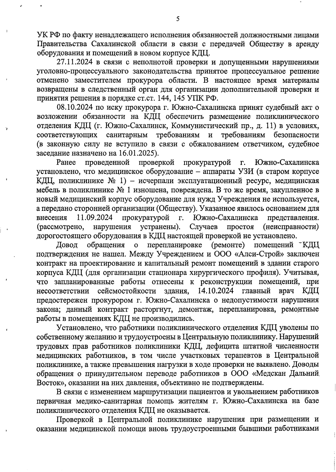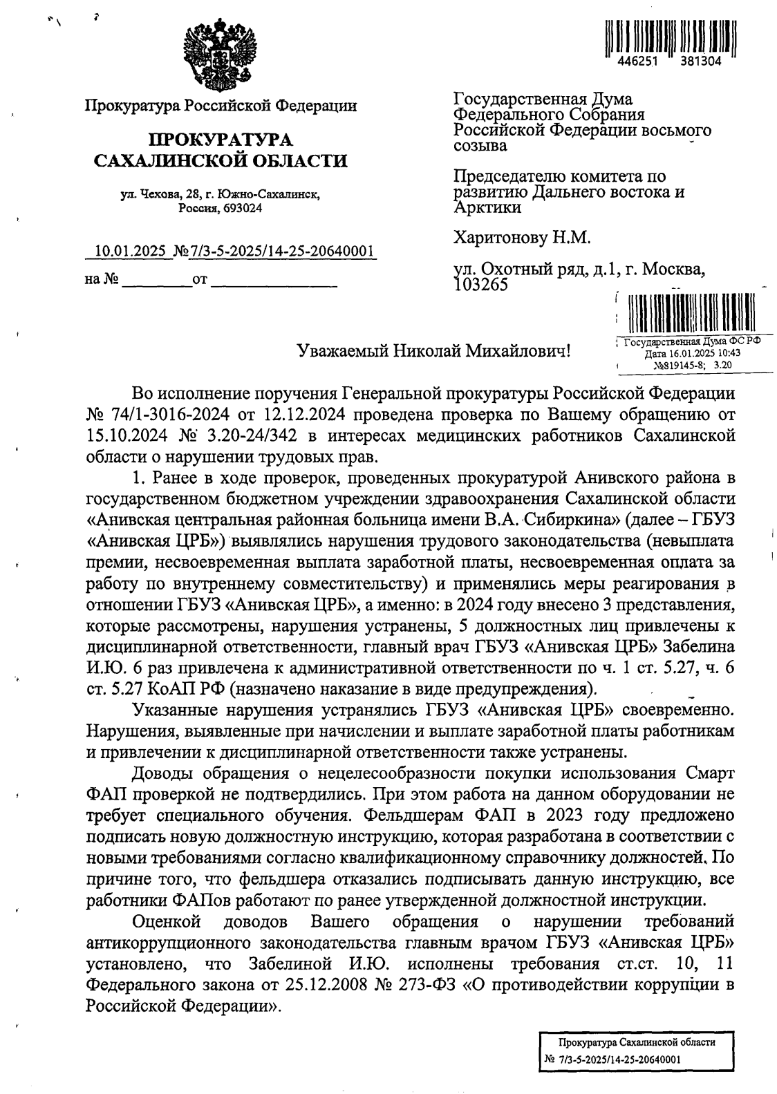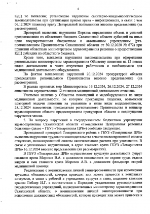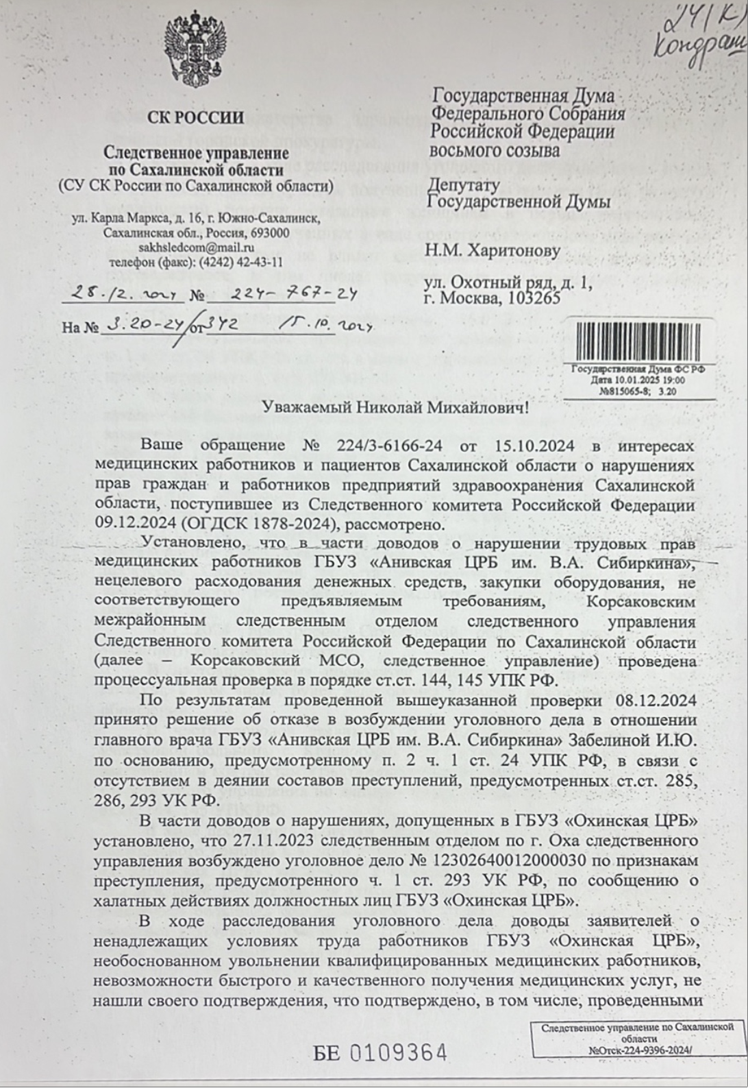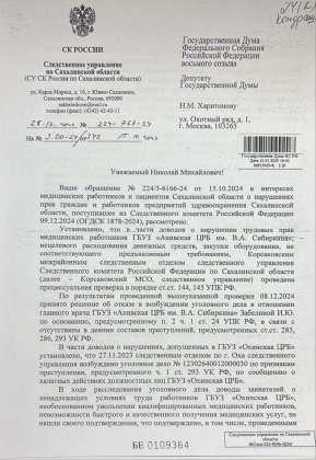 Об этом врачи подробно рассказали в коллективном обращении в Следственный комитет Российской Федерации, переданном главой независимого профсоюза сахалинских медицинских работников Маргаритой Маленко через руководителя фракции КПРФ в Сахалинской областной Думе Павла Ашихмина. Необходимо отметить активную роль председателя комитета Государственной Думы по развитию Дальнего Востока и Арктики, члена Президиума ЦК КПРФ Николая Харитонова. Находившийся с рабочим визитом в нашей области, Николай Михайлович близко к сердцу принял трудности сахалинских медиков и сделал все возможное, чтобы их слова были услышаны максимально оперативно и на самом высоком уровне.