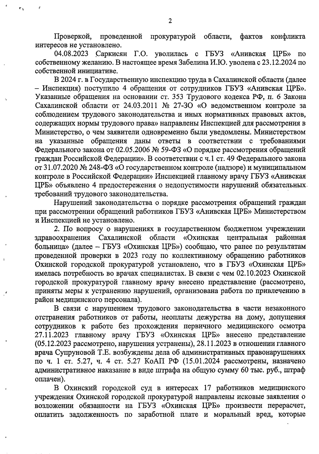 Сейчас из следственных органов начали поступать первые ответы. Многие указанные в обращении факты нашли свое подтверждение, кое-какие нарушения уже устранены или, по крайней мере, находятся в стадии устранения.