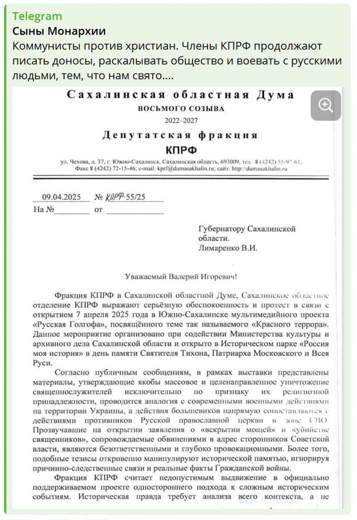Вот, например, выставку открыли — «Русская Голгофа» (https://t.me/ashikhmin_deputat65/418?single). Название-то какое пафосное! Сразу ясно – для антисоветского пиара, о чем грамотно расписал Сахалинский обком КПРФ. Типа, все жертвы красных — святые мученики, а белогвардейцы с японскими интервентами — просто ангелы во плоти, печеньки раздавали.