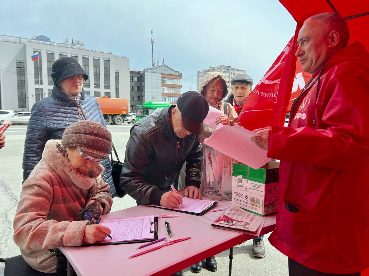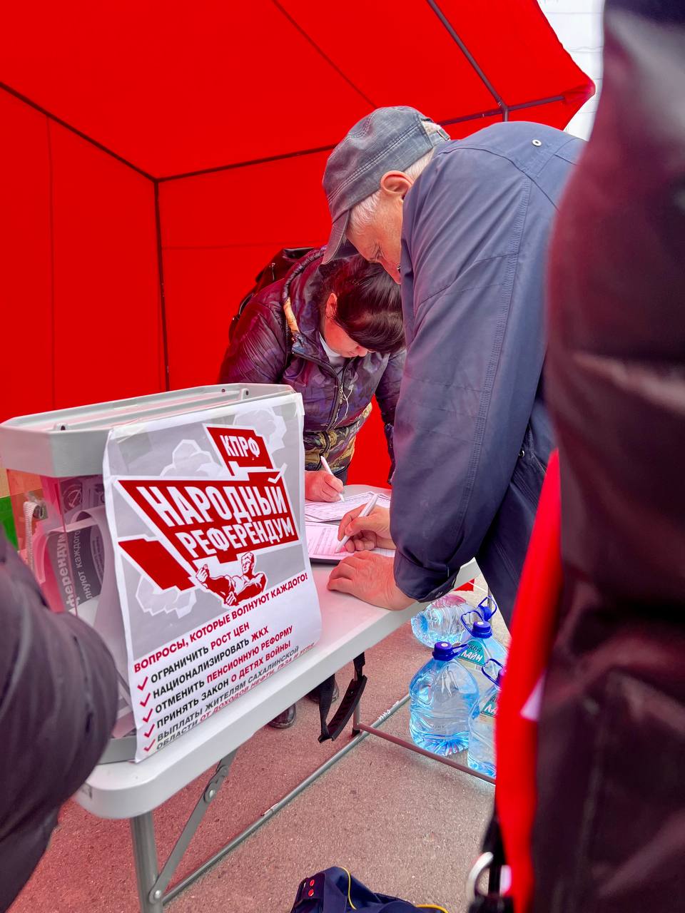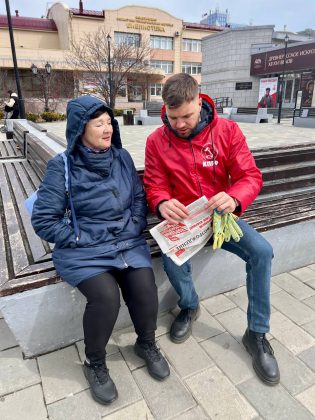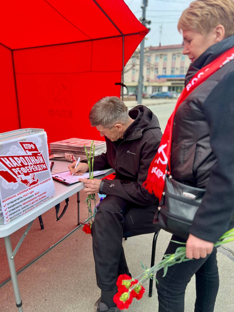 Открыл мероприятие второй секретарь Обкома Антон Варанкин; он напомнил, что рядом работает Красная палатка КПРФ, где каждый может проголосовать по пяти вопросам Народного референдума: ограничить торговую наценку на продукты и лекарства десятью процентами, национализировать коммунальное хозяйство, вернуть пенсионный возраст шестьдесят – пятьдесят пять лет, установить льготы «детям войны», выплачивать островитянам долю доходов от добычи углеводородов. Проголосовать можно очно, по бесплатному номеру 8 800 600 77 74 или заполнив нашу онлайн‑форму https://www.kprf-sakhalin.ru/2025/02/18/narodnyj-referendum-kprf/.