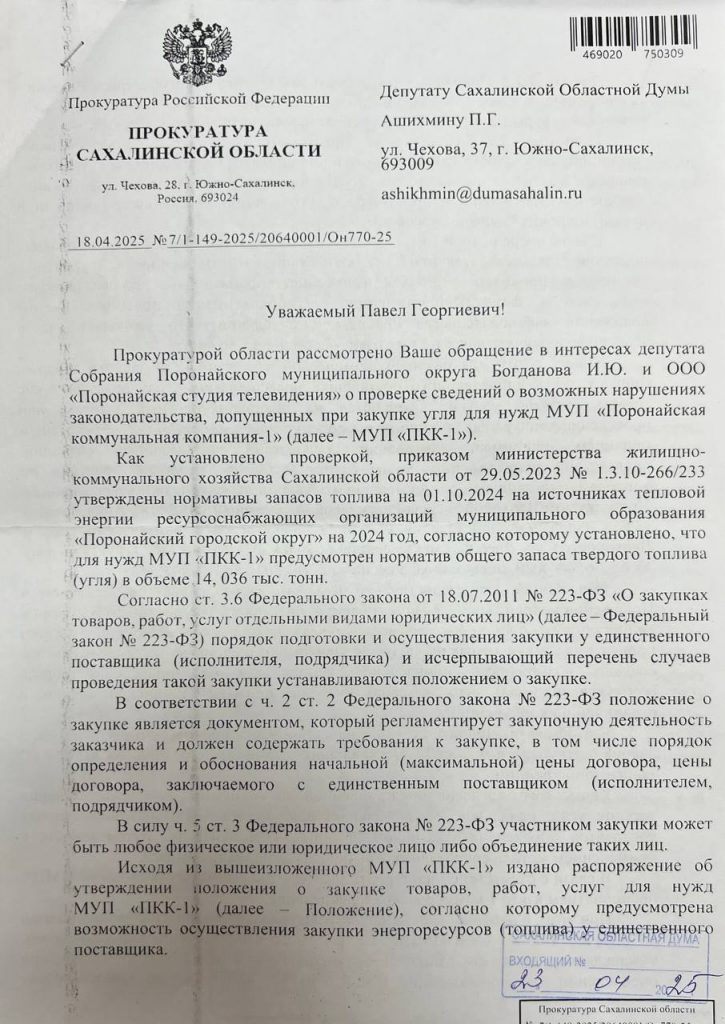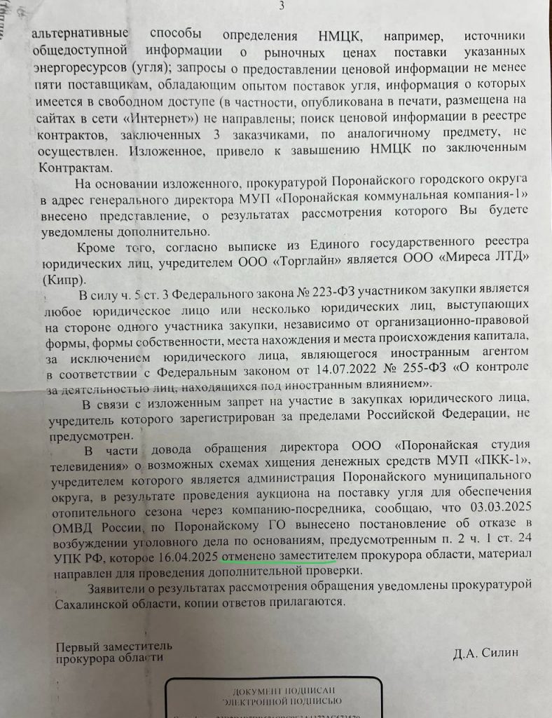 Друзья, хочу сообщить вам позицию по поводу ответа прокуратуры Сахалинской области на наши запросы о сомнительной схеме закупки угля для нужд Поронайского округа.