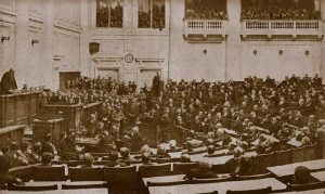 3. Перелом: от Думы к Советам. IV Государственная Дума начала работу накануне великих потрясений. В феврале 1917 года, в хаосе и после отречения царя, её распустило Временное правительство. Но именно в этот момент апогеем многовекового стремления народа к народовластию стали Советы. В октябре 1917 года лозунг Большевиков – «Вся власть Советам!» объединил миллионы. Советы рабочих, солдатских и крестьянских депутатов превратились в новую, подлинно массовую форму власти, которая, по замыслу первого руководителя советского государства Владимира Ильича Ленина, должна была принадлежать трудящимся напрямую. Для многих они стали символом социальной справедливости.