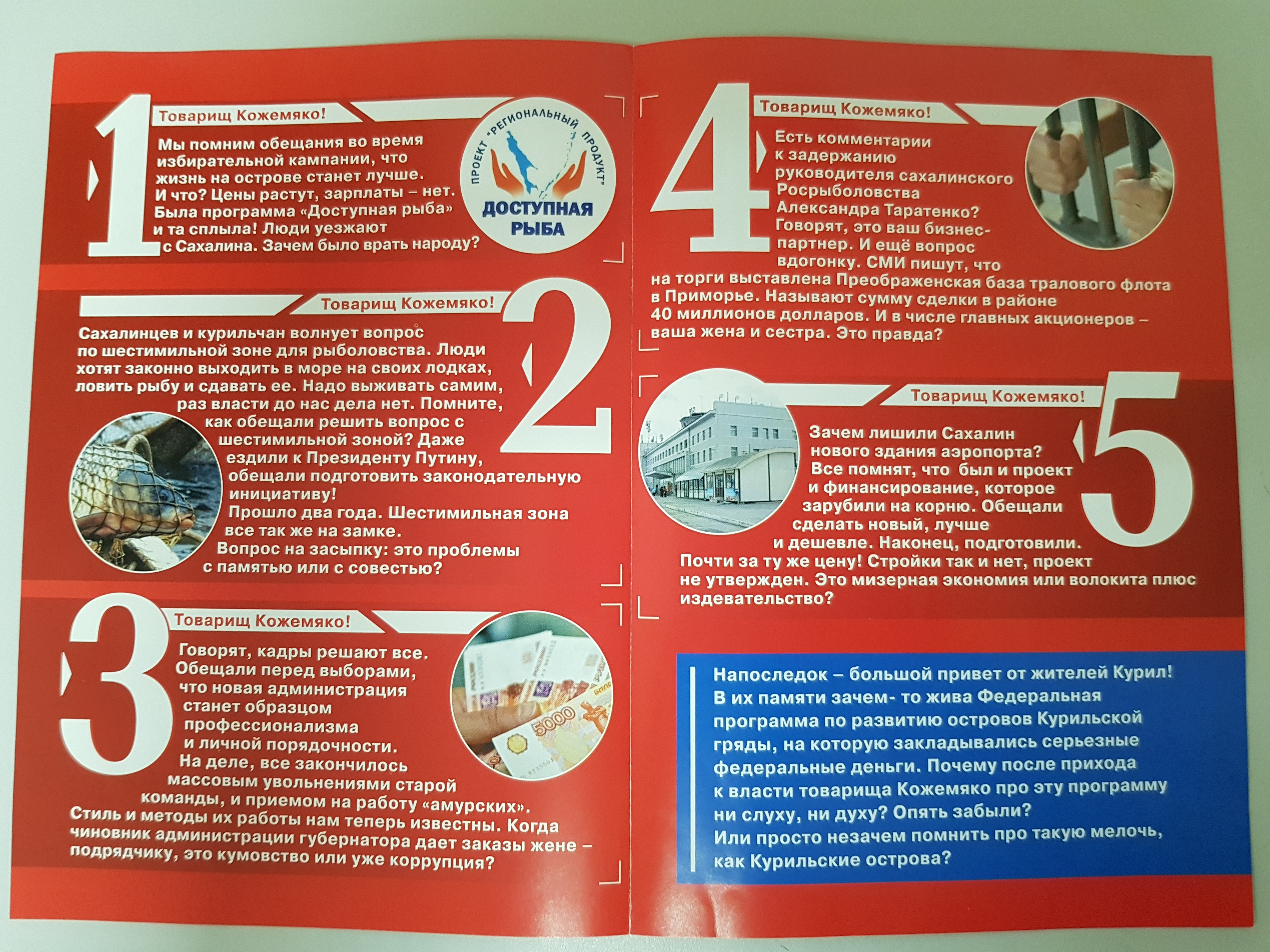 Сахалинское Региональное Отделение Политической Партии «КПРФ» официально сообщает: на территории Сахалинской области члены партии и граждане нашей области фиксируют массовый вброс агитационного материала под названием «Пять вопросов губернатору Олегу Кожемяко».