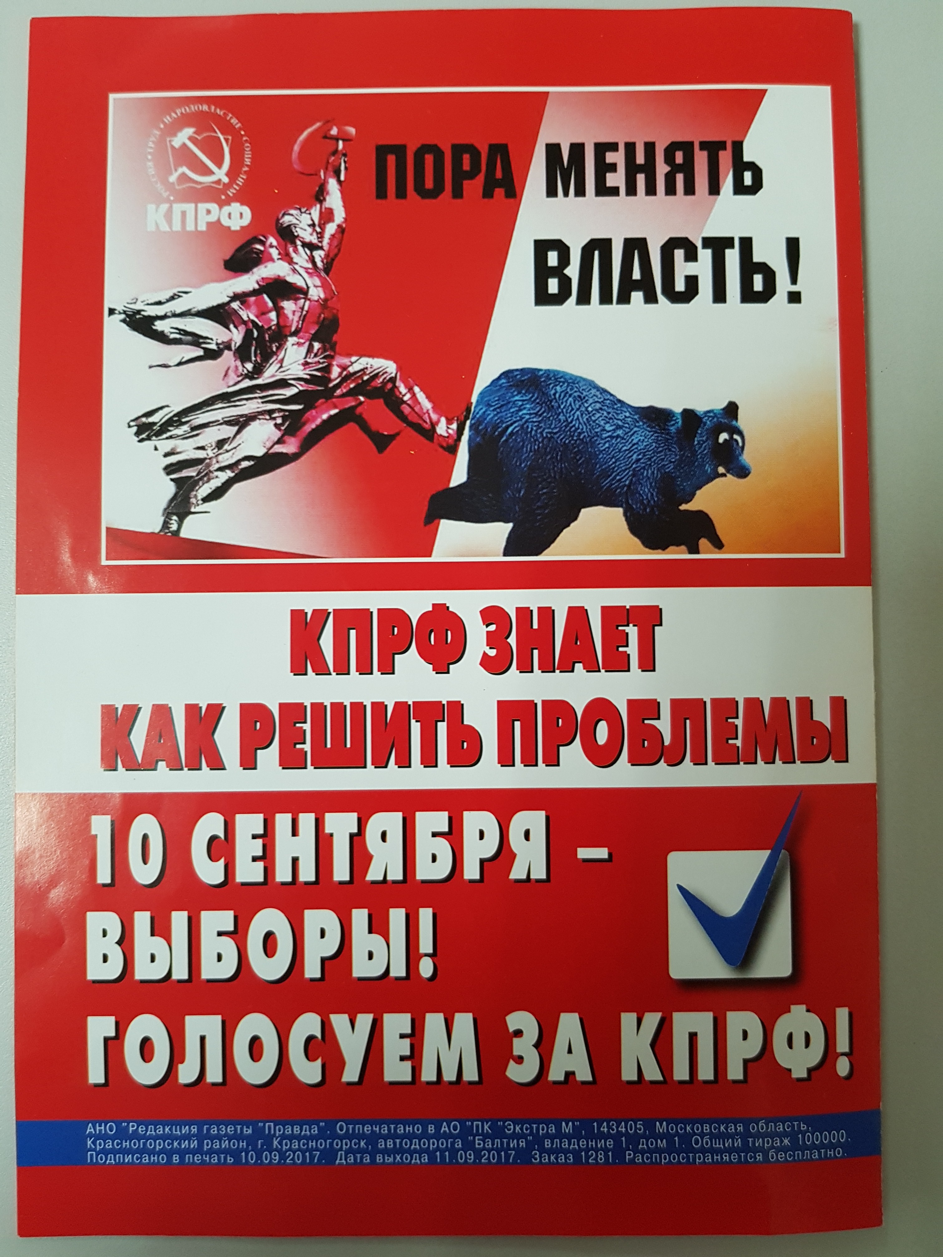 Доводим до вашего сведения – выходные данные агитационного материала выполнены с нарушениями, к процедуре изготовления и распространения листовки региональное отделение КПРФ отношения не имеет. Избирательная Комиссия Сахалинской Области (ИКСО) своевременно проинформирована о происшествии.