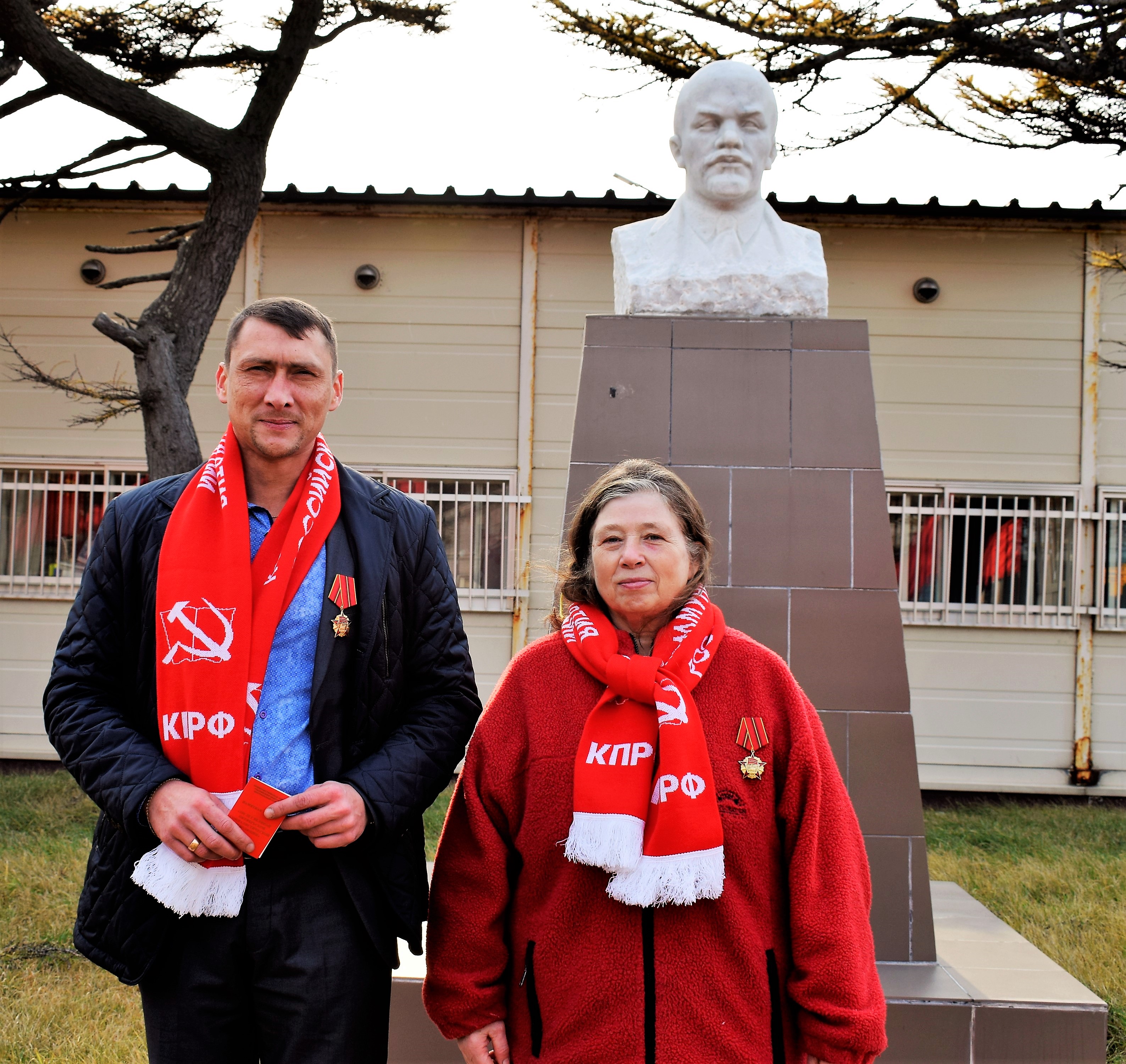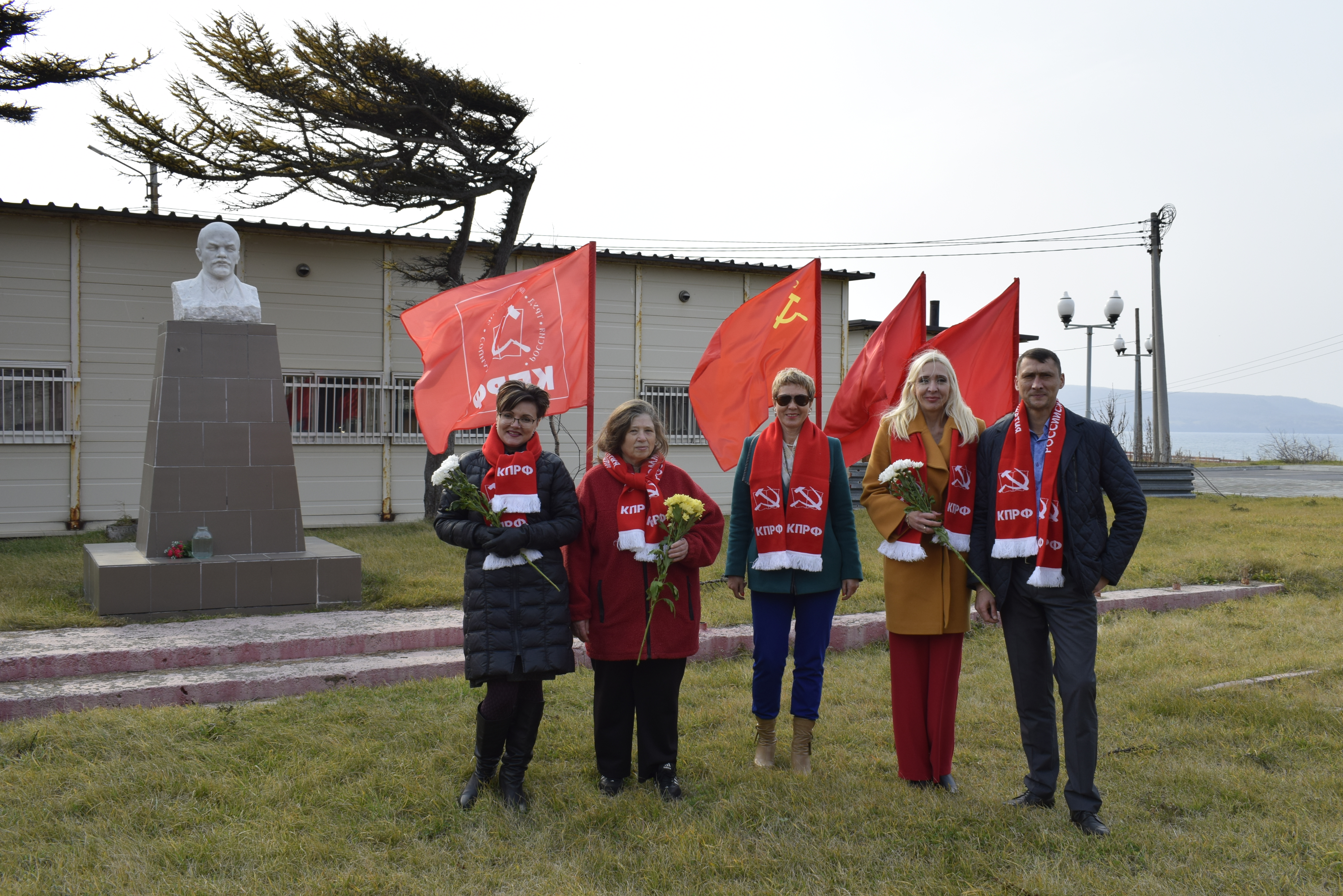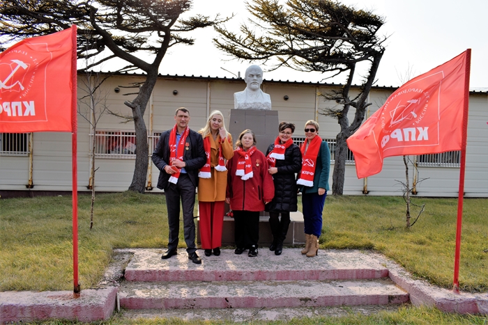 В день векового юбилея Октябрьской социалистической революции в России, коммунисты Курильского местного отделения КПРФ провели праздничную встречу членов компартии Российской Федерации у бюста В.И.Ленина в одном из городских скверов Курильска.