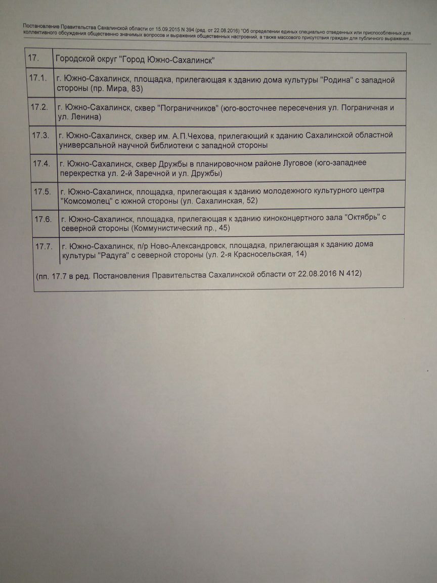 Количество мест, предназначенных для коллективного обсуждения общественно значимых вопросов и выражения общественного мнения сокращено в Южно-Сахалинске с семи до одного. Теперь горожане имеют возможность собраться на улице лишь в одном, специально отведенном правительством месте – на площадке у дома культуры “Родина”.