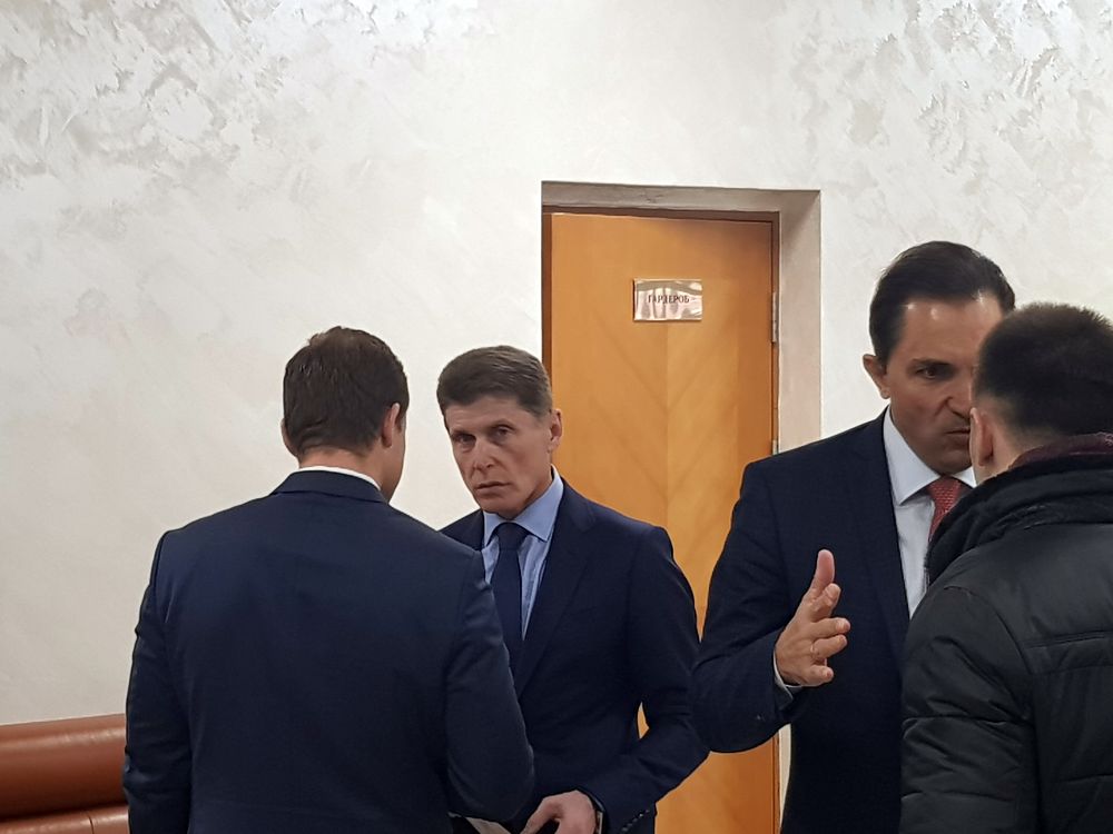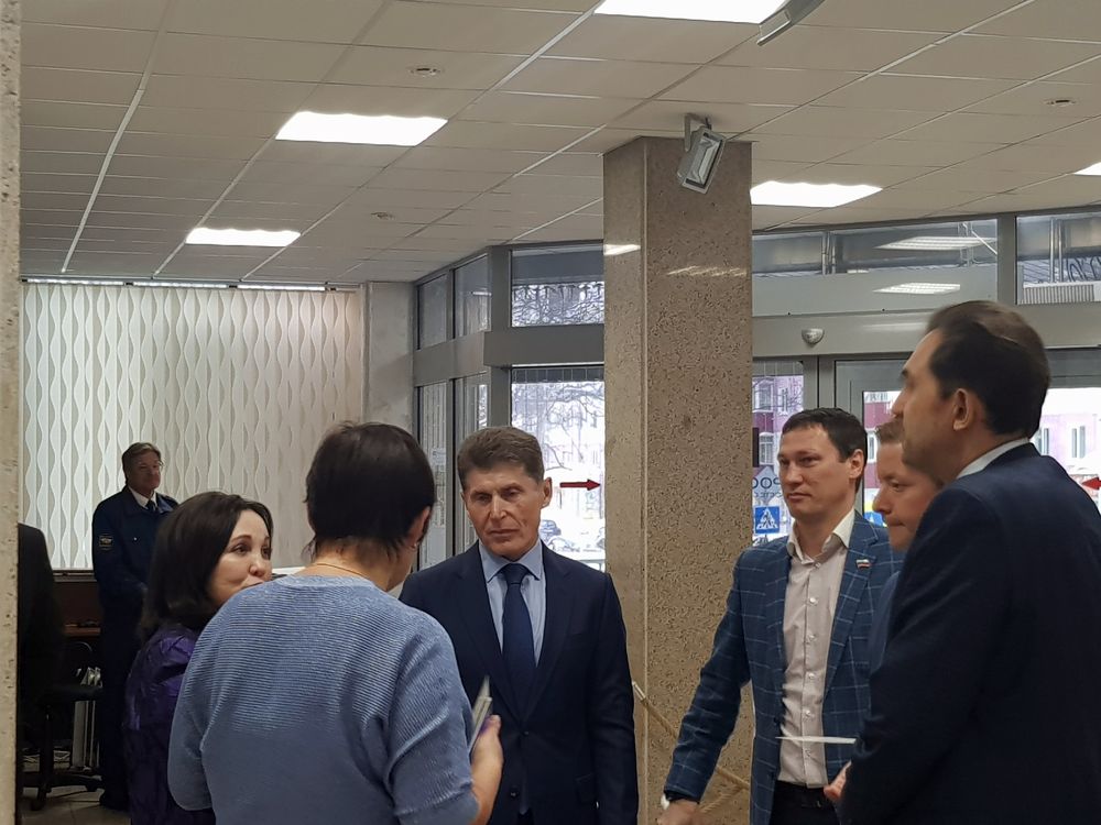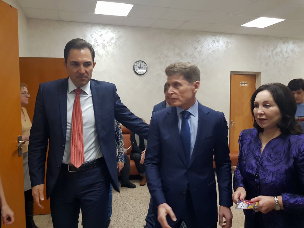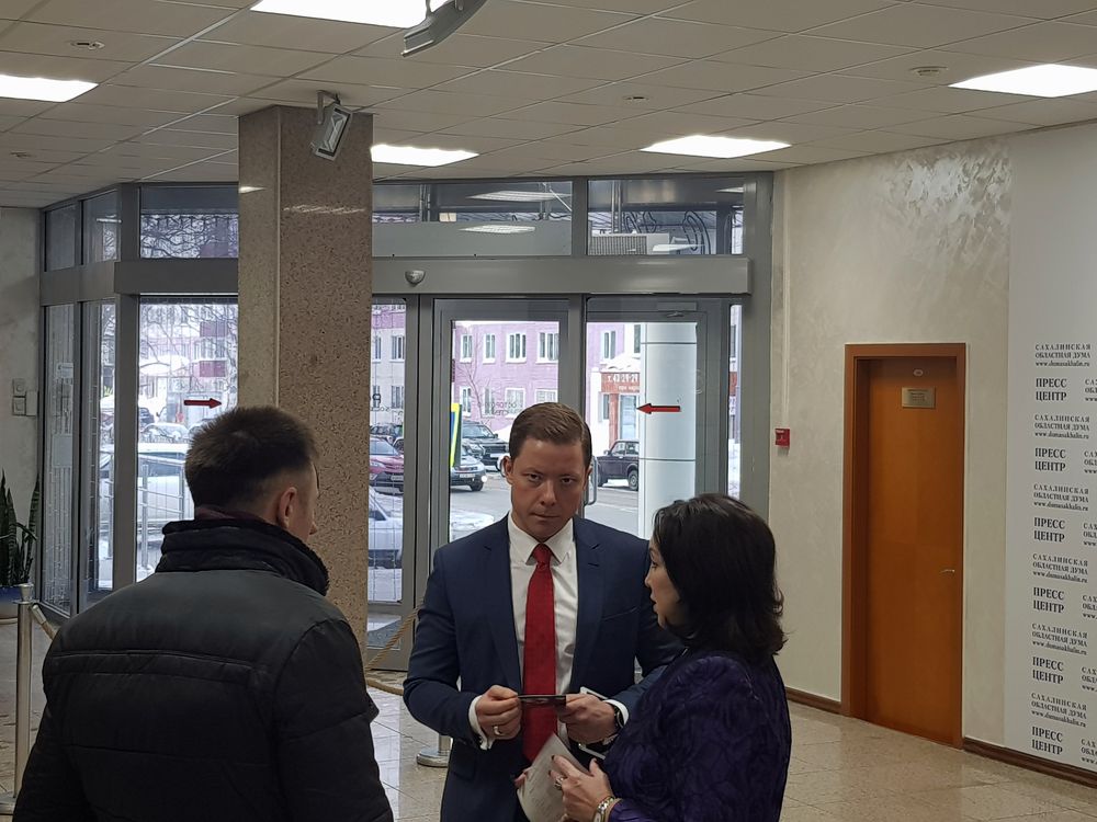 На входе их встречал Андрей Хапочкин, председатель Сахалинской областной Думы.