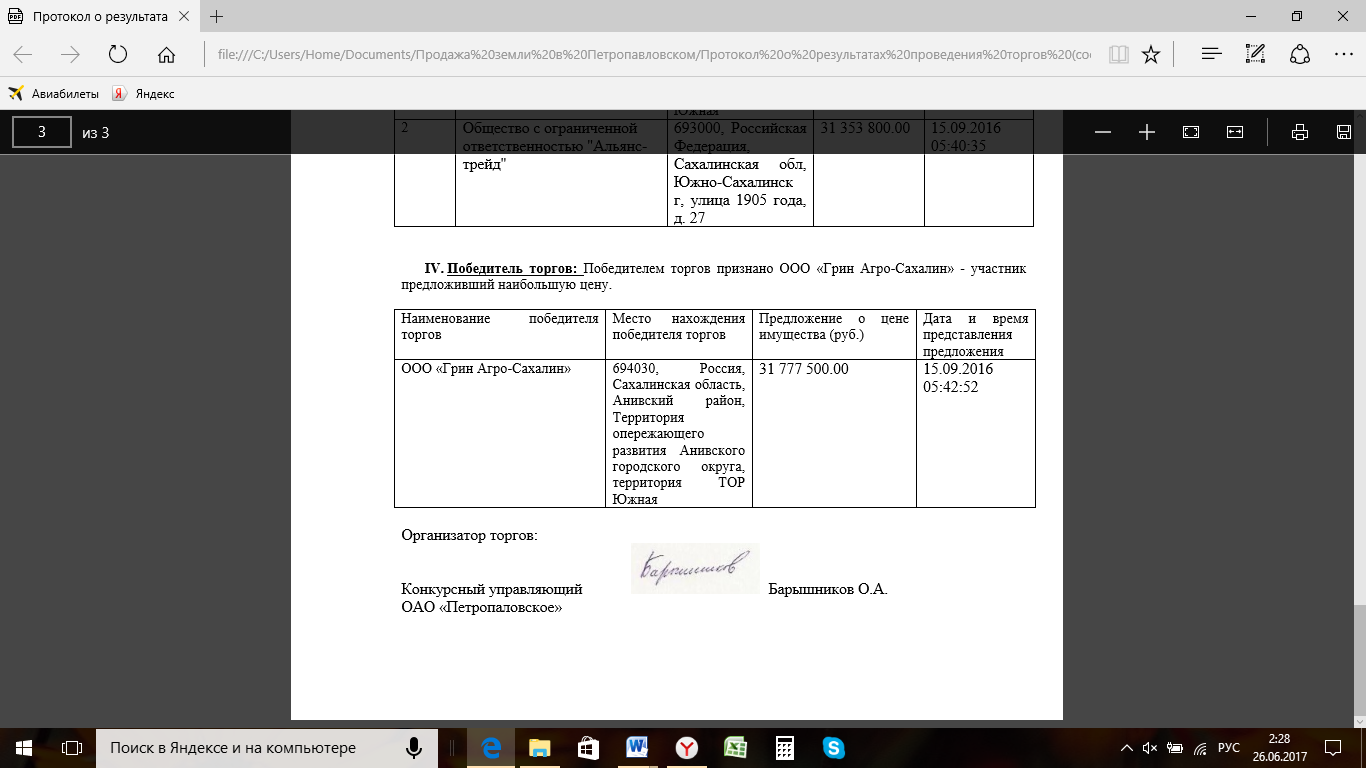 15 сентября 2016 года состоялись торги по продаже земельных участков банкротного ОАО «Петропавловское» в селе Петропавловское Анивского района Сахалинской области. Земли приобрела компания ООО «Грин Агро-Сахалин», созданная полтора года назад, а результаты торгов вызвали серьезные сомнения.