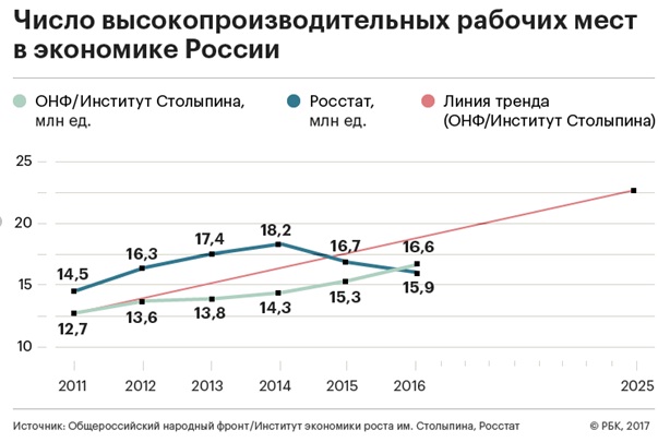 С рабочими местами ОНФ считает, что установка майского указа Путина по 25-ти млн. рабочих мест к 2018-2020 гг. ранее 2025-го года исполнена не будет. Росстат даже более пессиместичен.