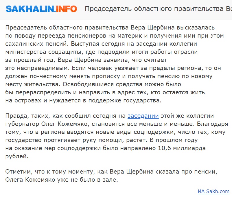 Информационное агенство SAKH.INFO распространило заявление председателя правительства Сахалинской области Веры Щербины, в котором говорится, о том, что “это несправедливо, когда наши жители уезжают с островов и продолжают получать сахалинскую пенсию”: