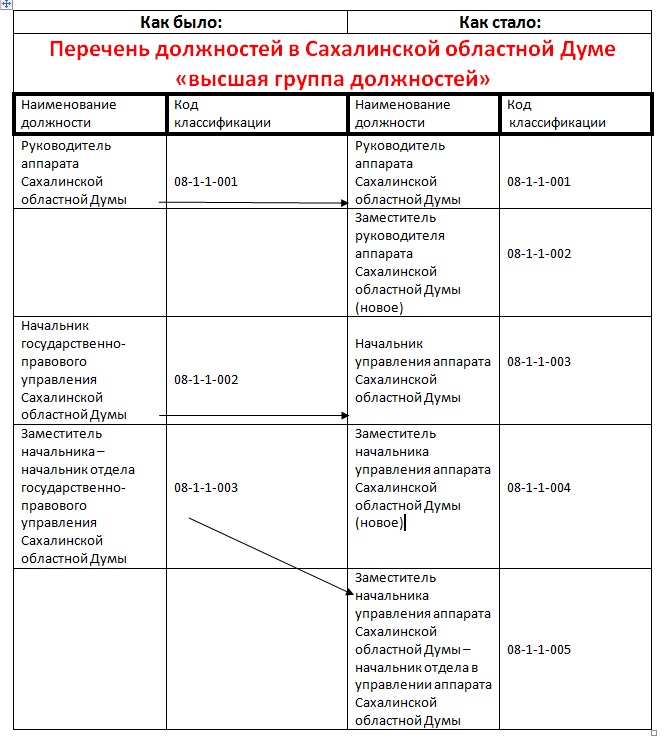 В предложенных изменениях производится смена наименований уже существующих должностей руководства государственно-правового управления и вводятся новые две: заместитель руководителя аппарата Сахалинской областной Думы  и заместитель начальника управления аппарата Сахалинской областной Думы. Без изменений остается лишь должность “руководителя аппарата Сахалинской областной Думы”.
