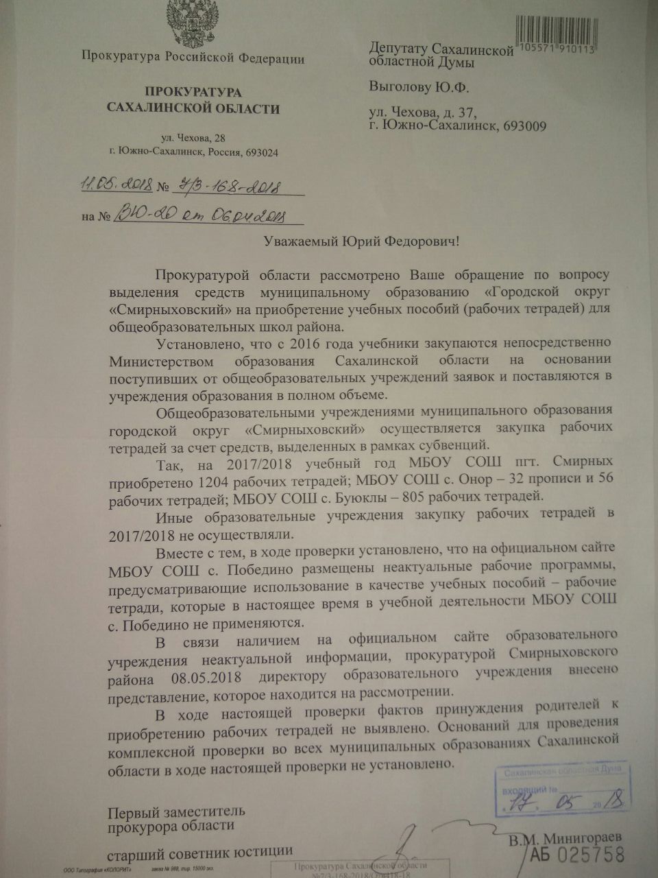 Ответ сахалинской прокуратуры получен – половина общеобразовательных учреждений Смирныховского района ( 3 из 6-ти ) средств на закупку рабочих тетрадей не получают, фактов принуждения к приобретению родителями тетрадей не выявлено. А на сайте школы села Победино размещена устаревшая информация, в нынешнем своем виде учебная программа не предусматривает использование рабочих тетрадей.