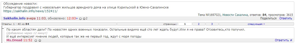 Тем временем, региональные власти ждут софинансирования в рамках федеральной программы переселения из ветхого и аварийного жилья и, не дождавшись, одновременно договариваются о помощи Министерству Обороны. А сахалинцы возмущаются непрозрачными схемами предоставления арендного жилья сотрудникам силовых ведомств.