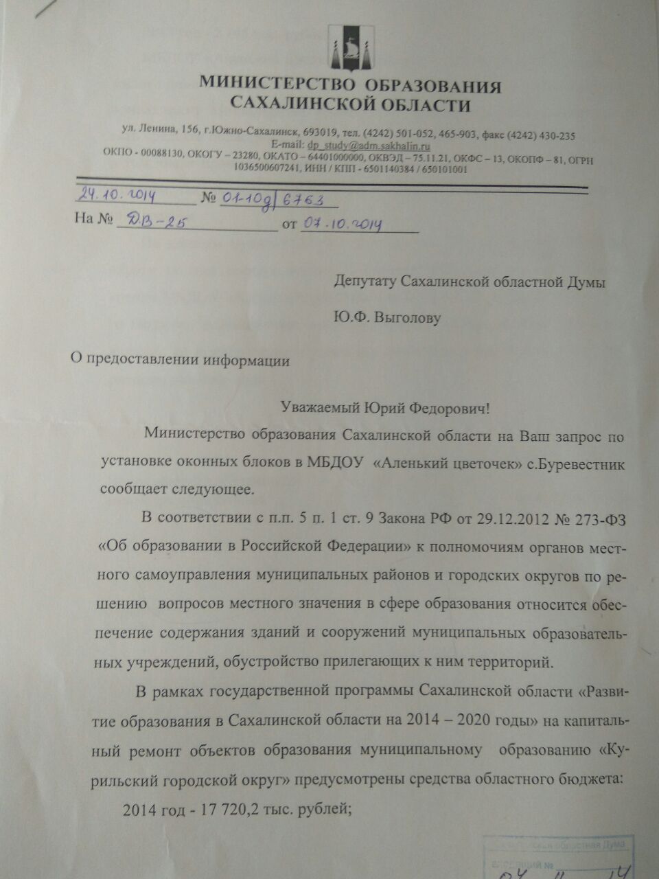 «Договоренности» между федеральным министерством и исполнительной властью в регионе, в данном случае, должны основываться на соблюдении, требований Бюджетного Кодекса РФ, бюджета Сахалинской области на текущий период, и обязаны (договоренности) пройти оценку в Правовом Управлении Сахалинской областной Думы, в региональной Счетной Палате.