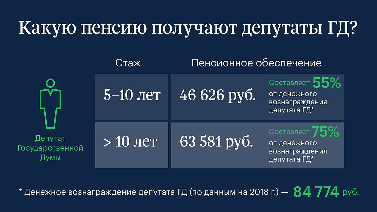 Таким образом, пенсионное обеспечение депутата ГД составляет 46 тыс. 626 рублей при исполнении обязанностей от пяти до 10 лет и 63 тыс. 581 рубль при исполнении обязанностей 10 лет и более.