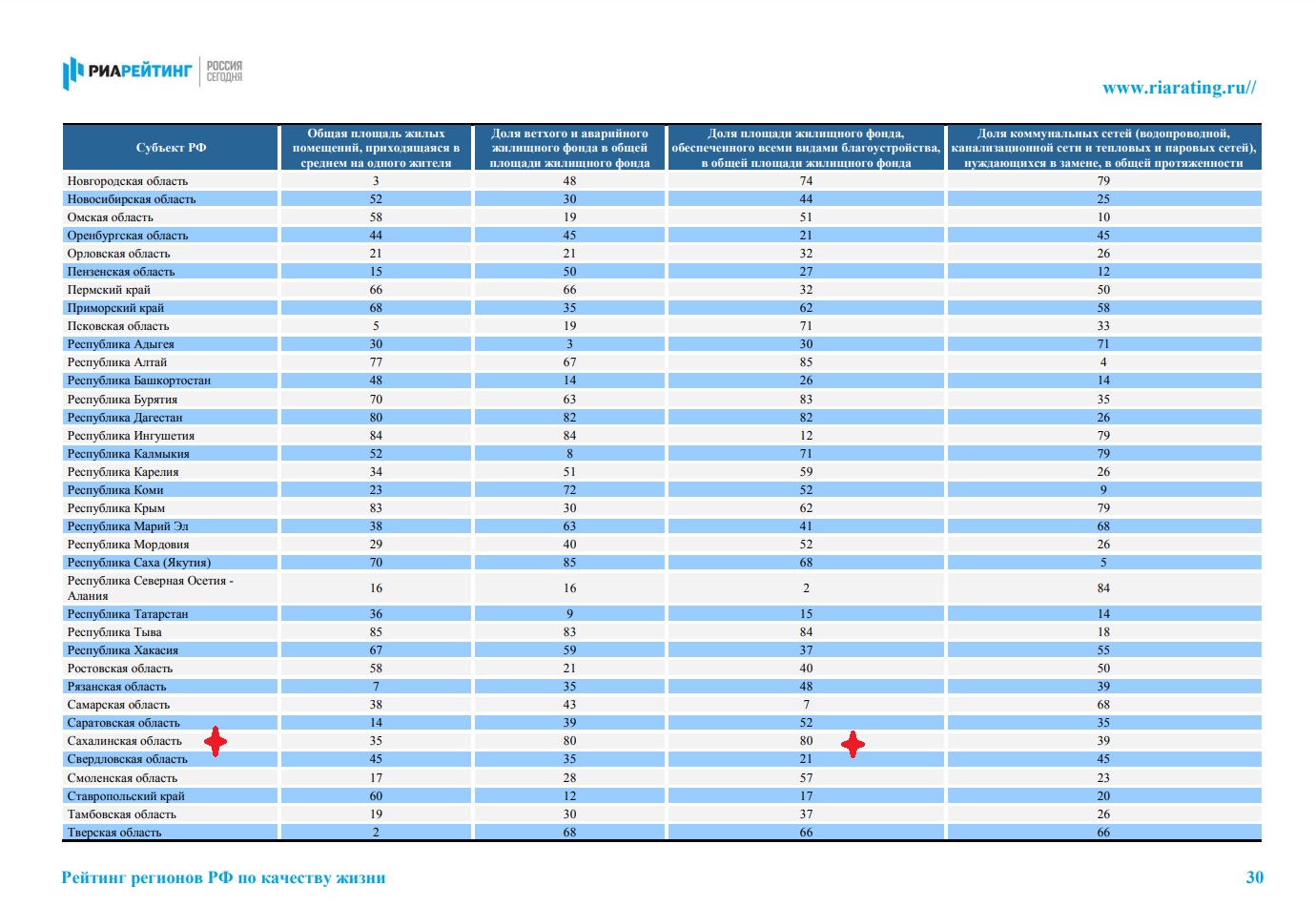 По версии РИА-Рейтинг, основанных на данных органов государственной статистики, Сахалинская область занимает 80 место из доступных 85 в категории “Доля площади жилищного фонда, обеспеченного всеми видами благоустройства, в общей площади жилого фонда”.