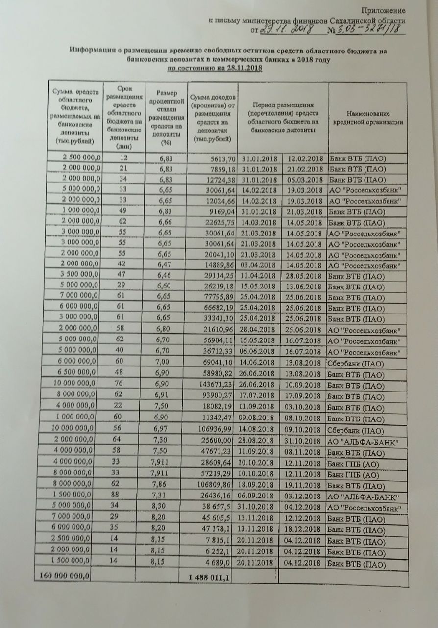 Как нам стало известно, сахалинское правительство под руководством губернатора Олега Кожемяко и его председателя Веры Щербины, разместило в 2018 году на депозитах коммерческих банков 160 млрд рублей средств регионального бюджета, которые чиновники посчитали “свободными”.
