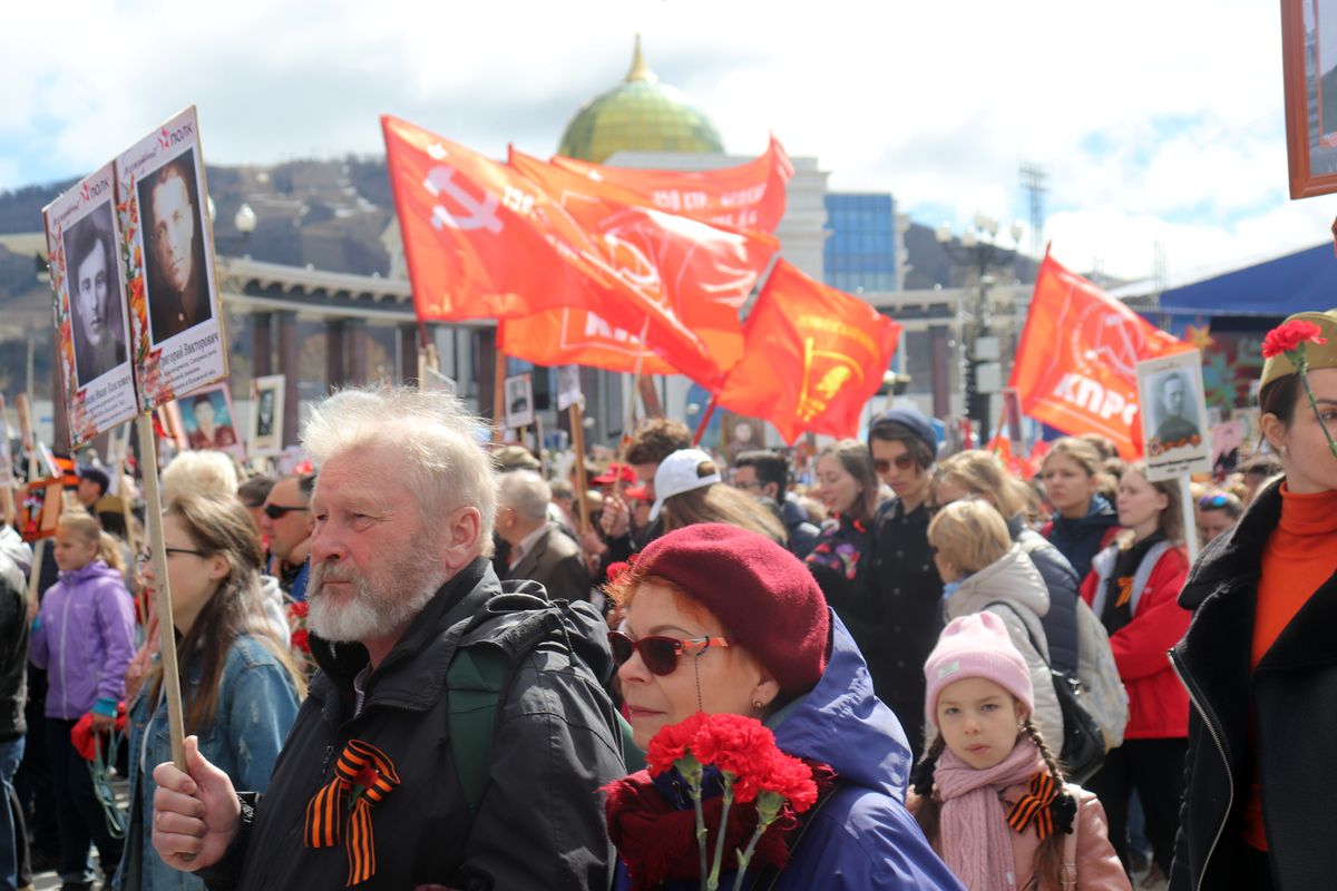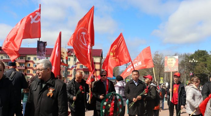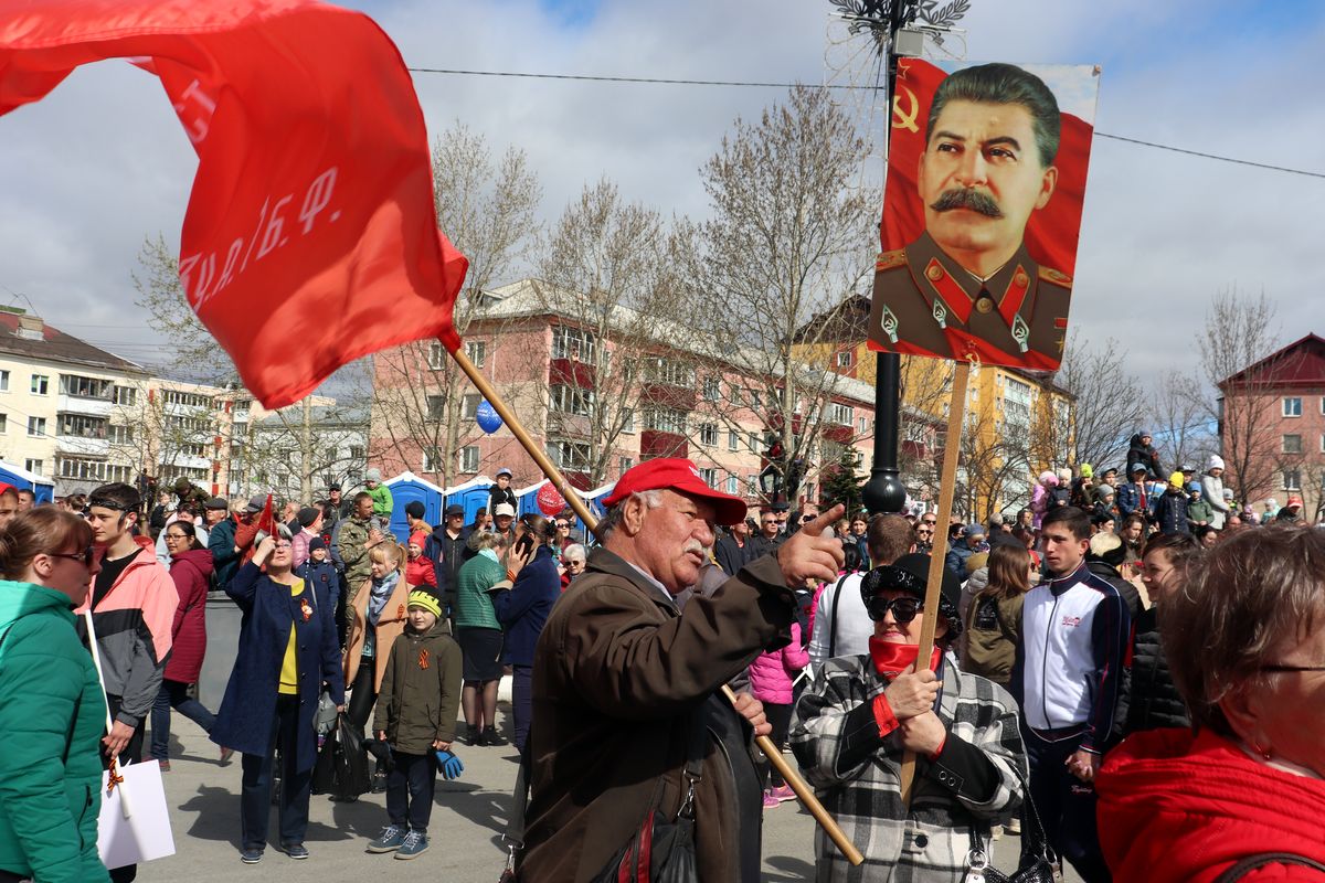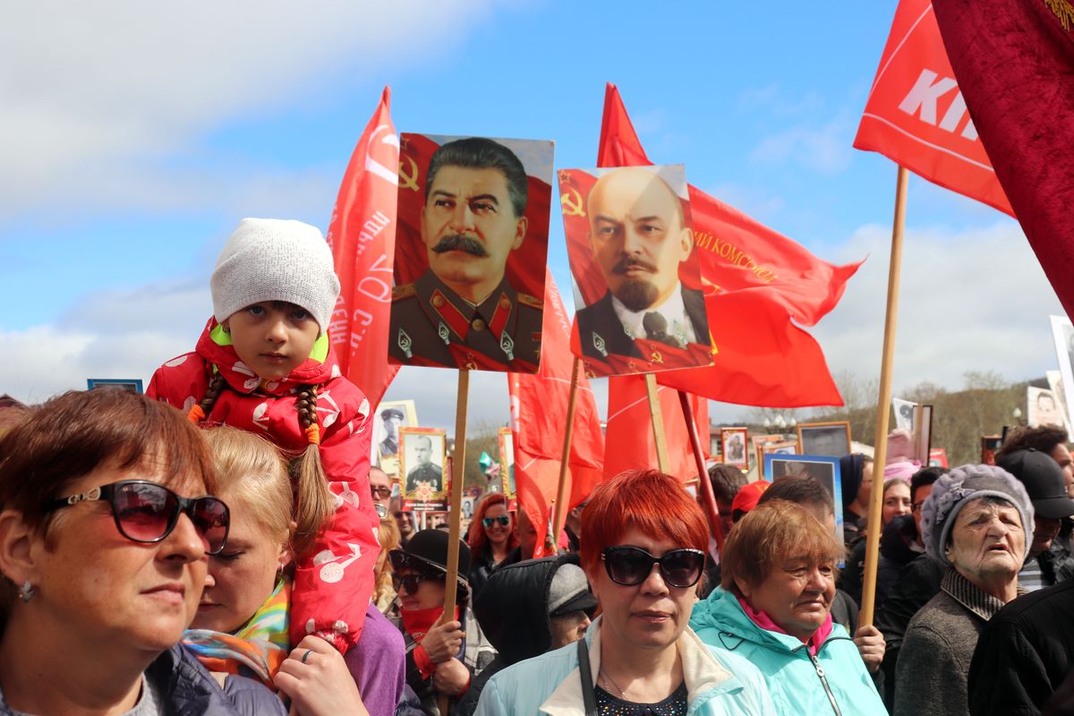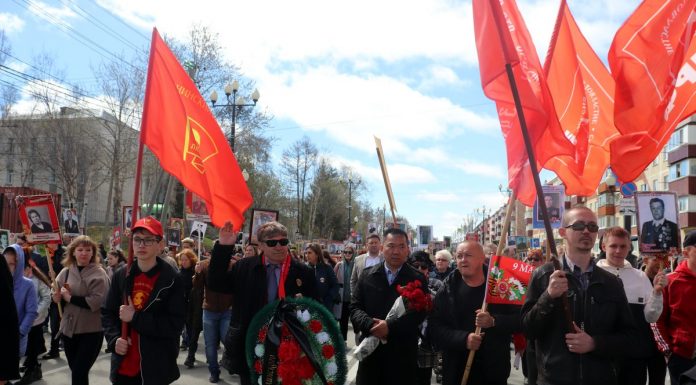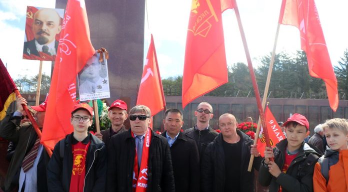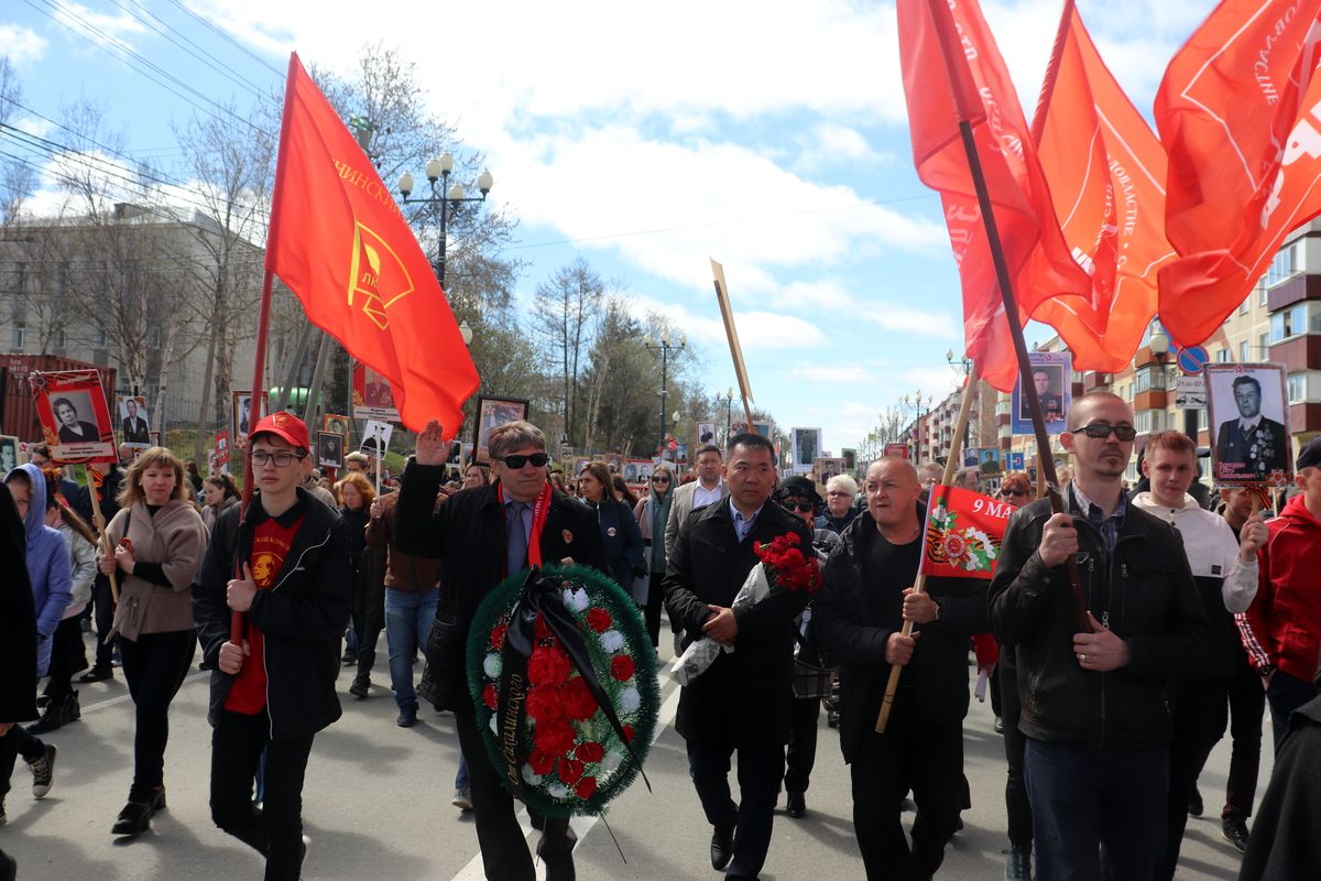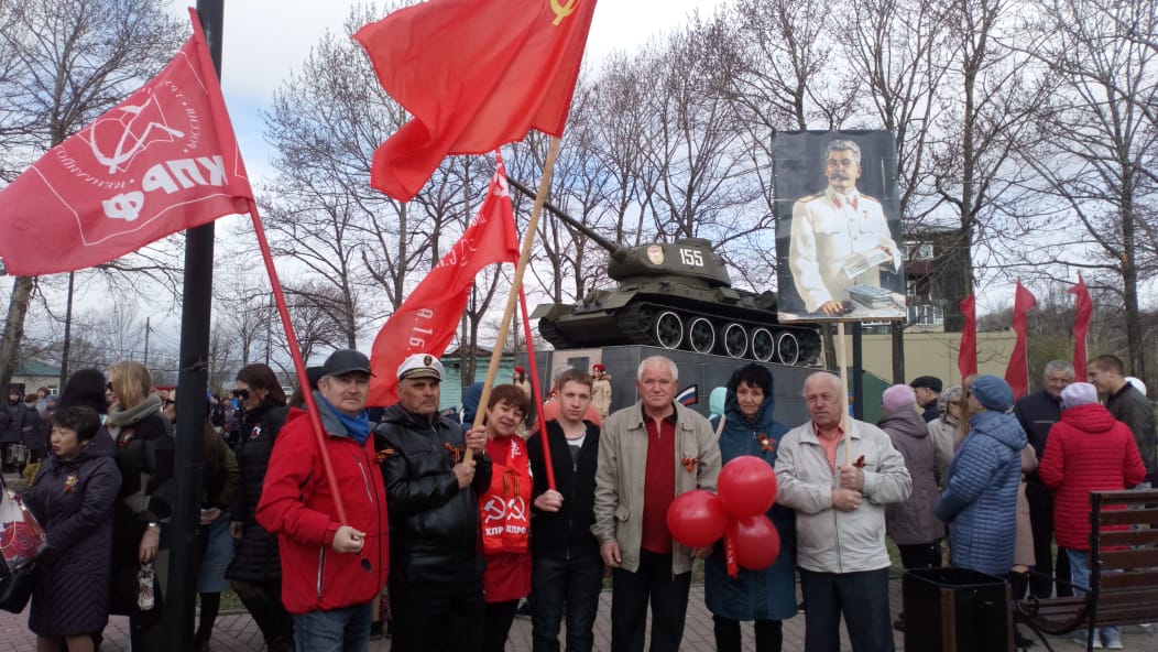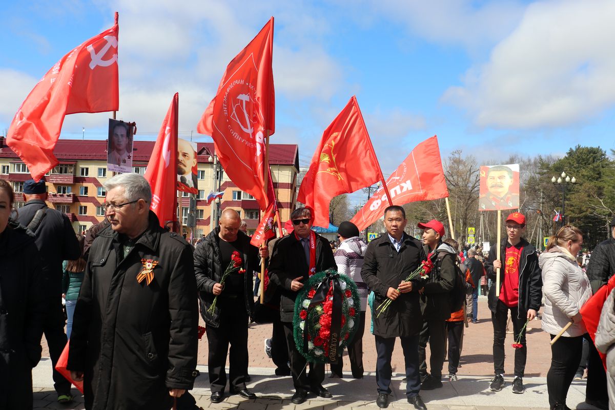 В годовщину великой Победы советского народа над нацистской Германией сахалинские коммунисты и члены ЛКСМ вышли на площадь и прошли в колонне Бессмертного полка с неизменной атрибутикой – Красным флагом победителей, портретами генералисимуса Иосифа Сталина и вождем мирового пролетариата Владимира Ленина.